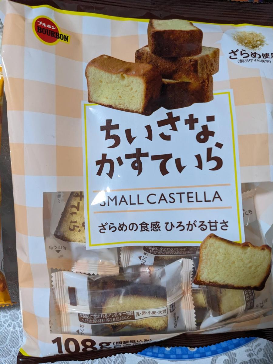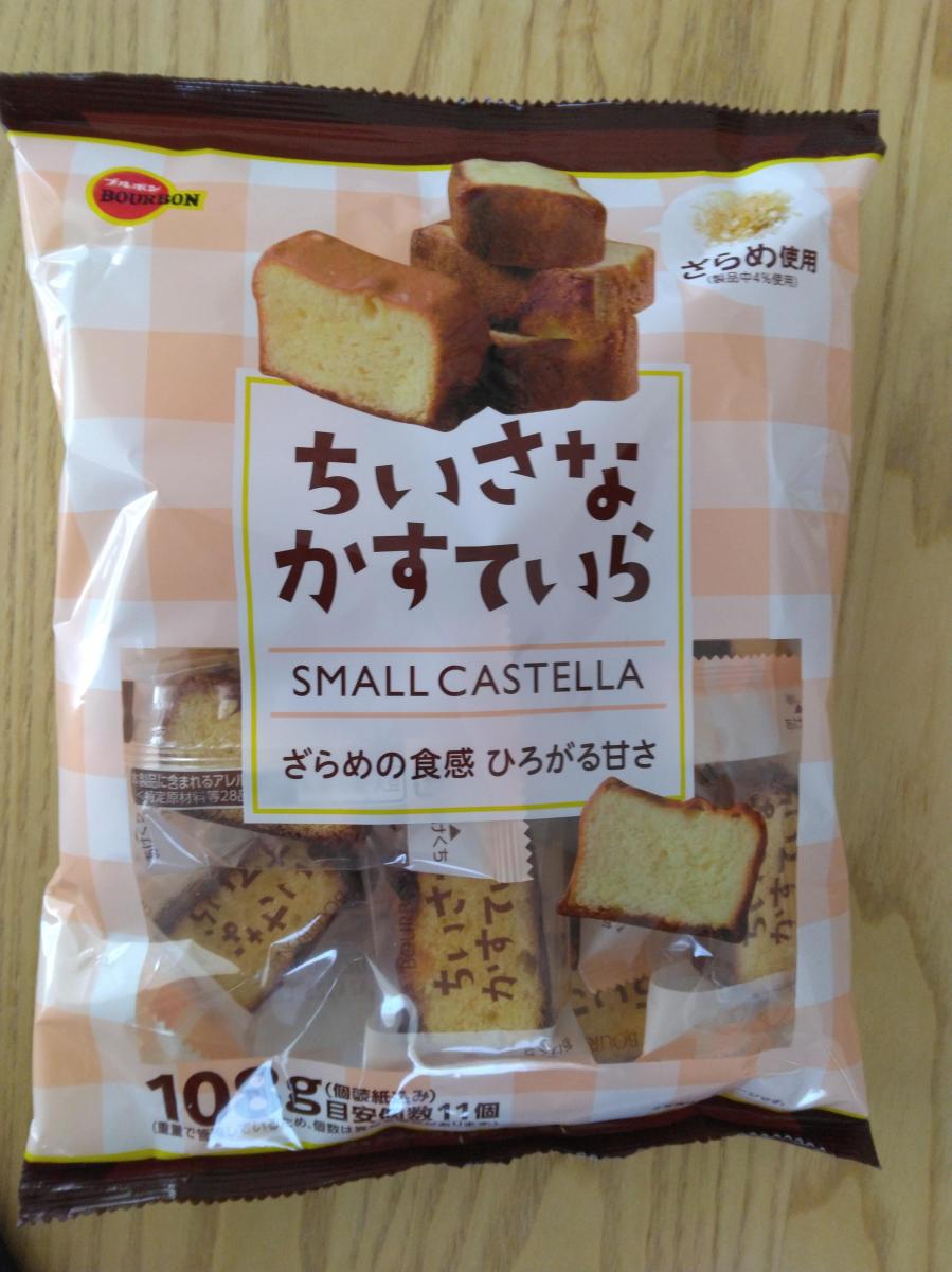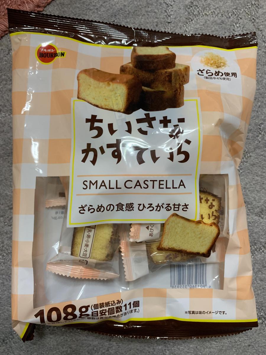 パッケージからして可愛いですね。カステラのサイズも小さくて可愛いです。小さくて物足りないという感じはなくて、むしろこの小ささだからこそちょうどいいと思えるサイズでした。カステラと言いつつもただのスポンジなんてことはよくありますが、こちらはさすがブルボンです。ちゃんとザラメもあって、カステラとして楽しめます。ふわふわで甘くておいしかったです。