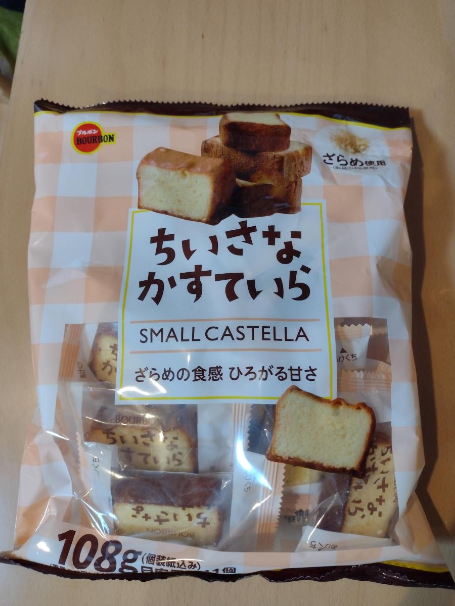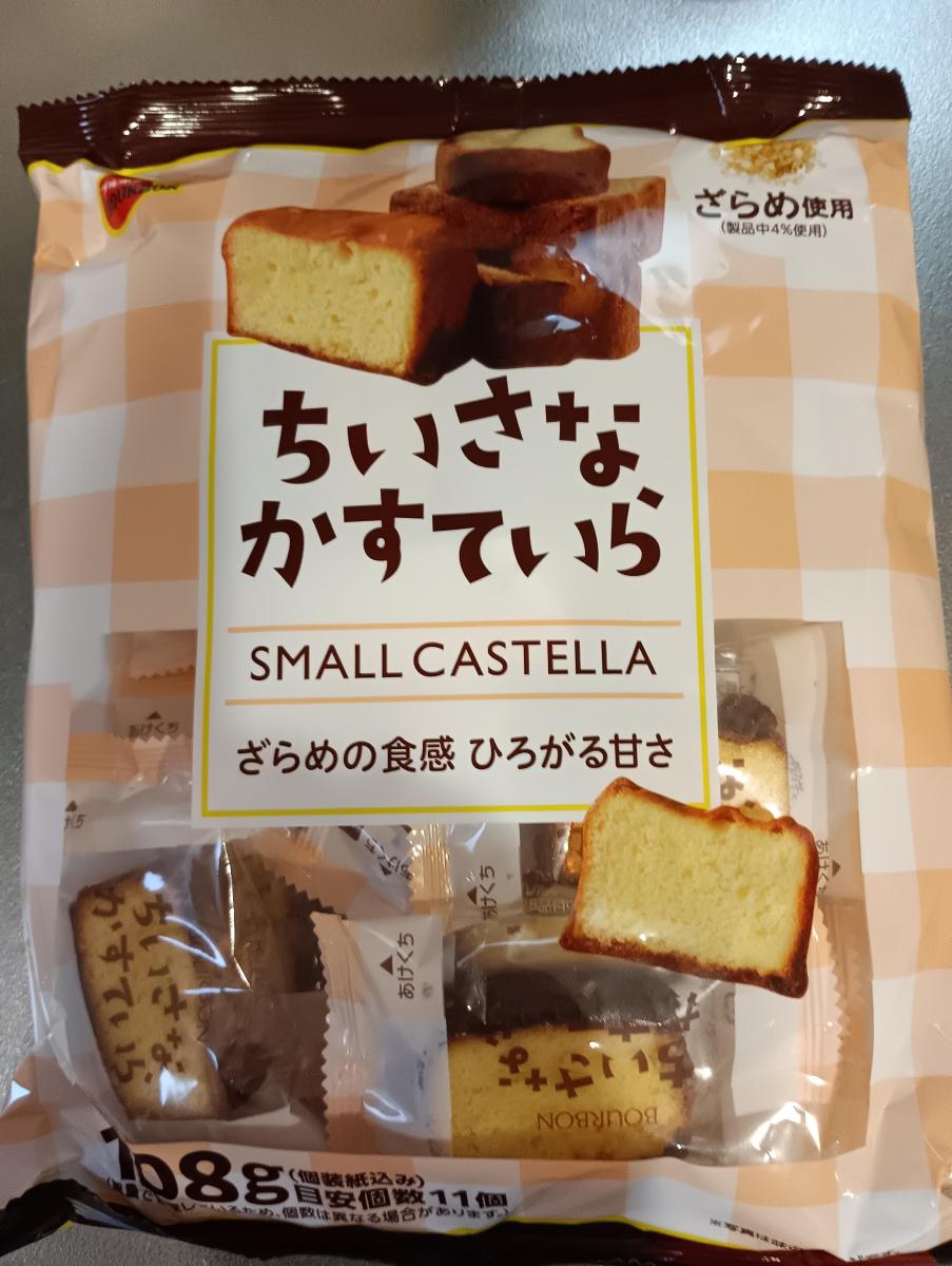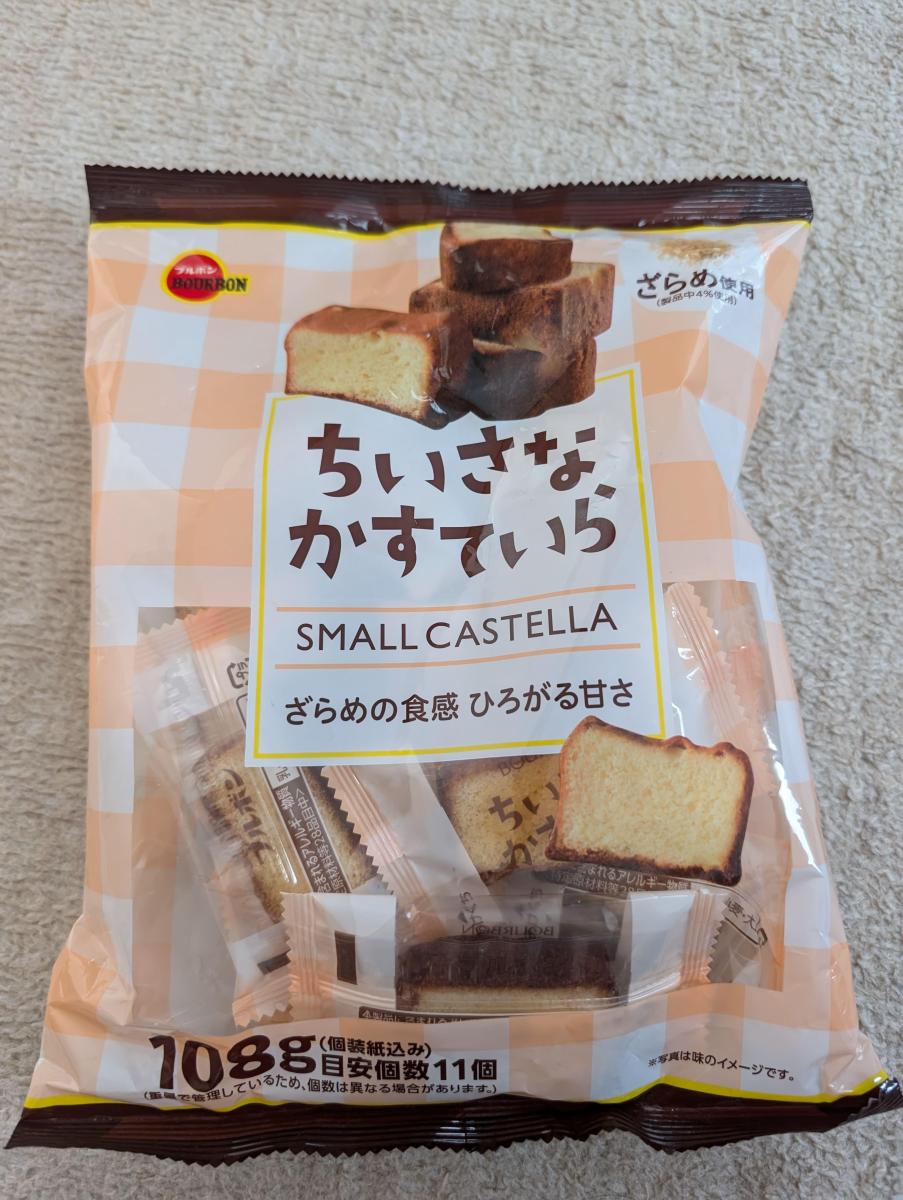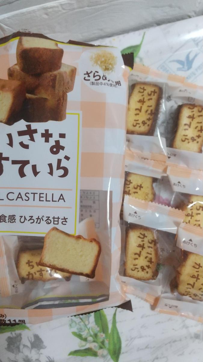 パッケージからして可愛いですね。カステラのサイズも小さくて可愛いです。小さくて物足りないという感じはなくて、むしろこの小ささだからこそちょうどいいと思えるサイズでした。カステラと言いつつもただのスポンジなんてことはよくありますが、こちらはさすがブルボンです。ちゃんとザラメもあって、カステラとして楽しめます。ふわふわで甘くておいしかったです。