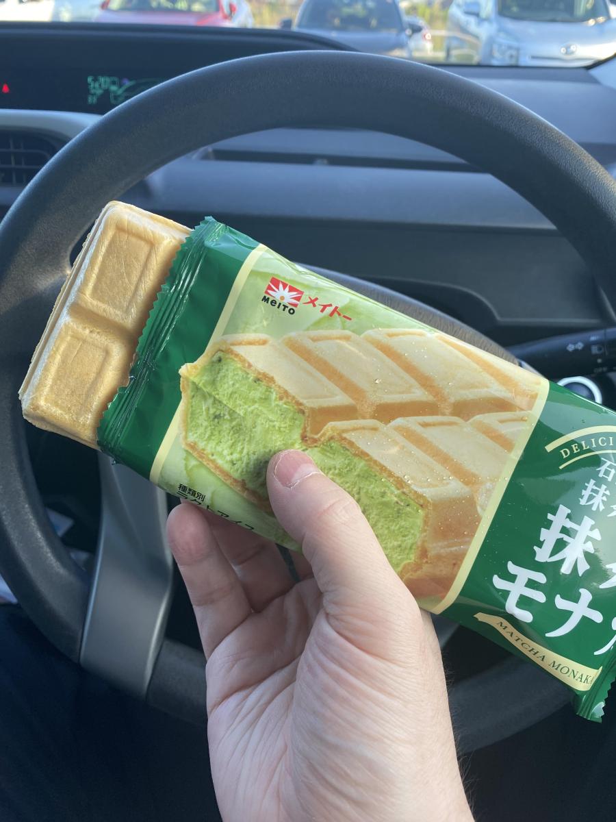 ややパリッとしたモナカ生地にあっさりとした抹茶アイスがサンドされています。抹茶味は濃厚ではなく、バニラアイスに抹茶が加わったという感じです。濃厚本格的を求める方には向いていませんが、気軽に抹茶アイスを楽しむにはぴったりです。なんといってもコスパがよいのが最高です。