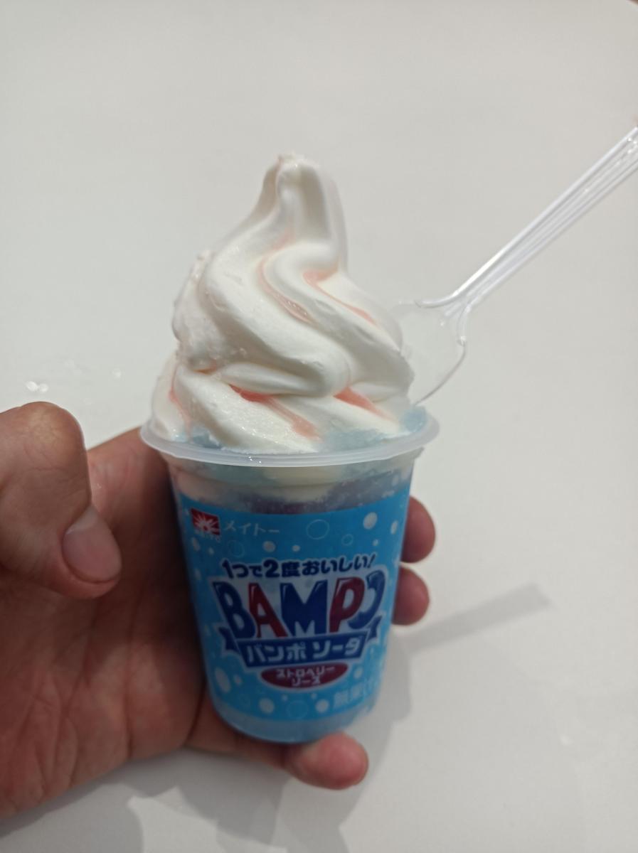 このバンポソーダを購入して食べてみれば、まずソフトクリーム部分にて滑らかさに浸りながらこってりとなる甘さを味わえた後に、下部分のソーダを食べればスカッとなる爽やかさが詰まった清涼感を楽しめて、そしてこれらを食べ合わせれば甘さと爽快感が旨く溶け込ませた旨味を実感できるという、食べ分けてそれぞれの旨さも体験できる七変化さを楽しむ事ができました!