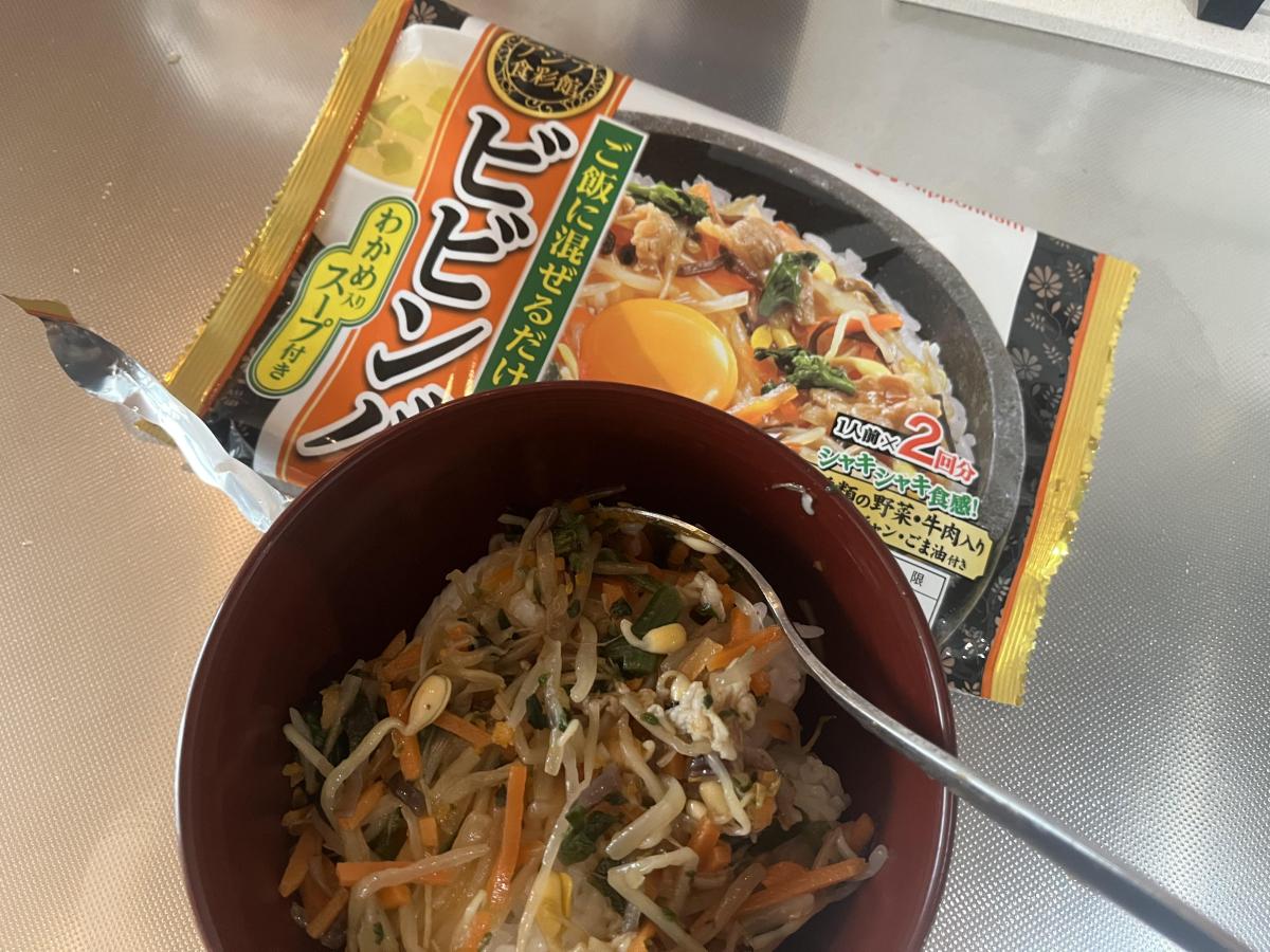 こちらは、温かいご飯に混ぜるだけで楽しめる手軽なビビンバの素。お昼ご飯用に買ってきて食べてみました!