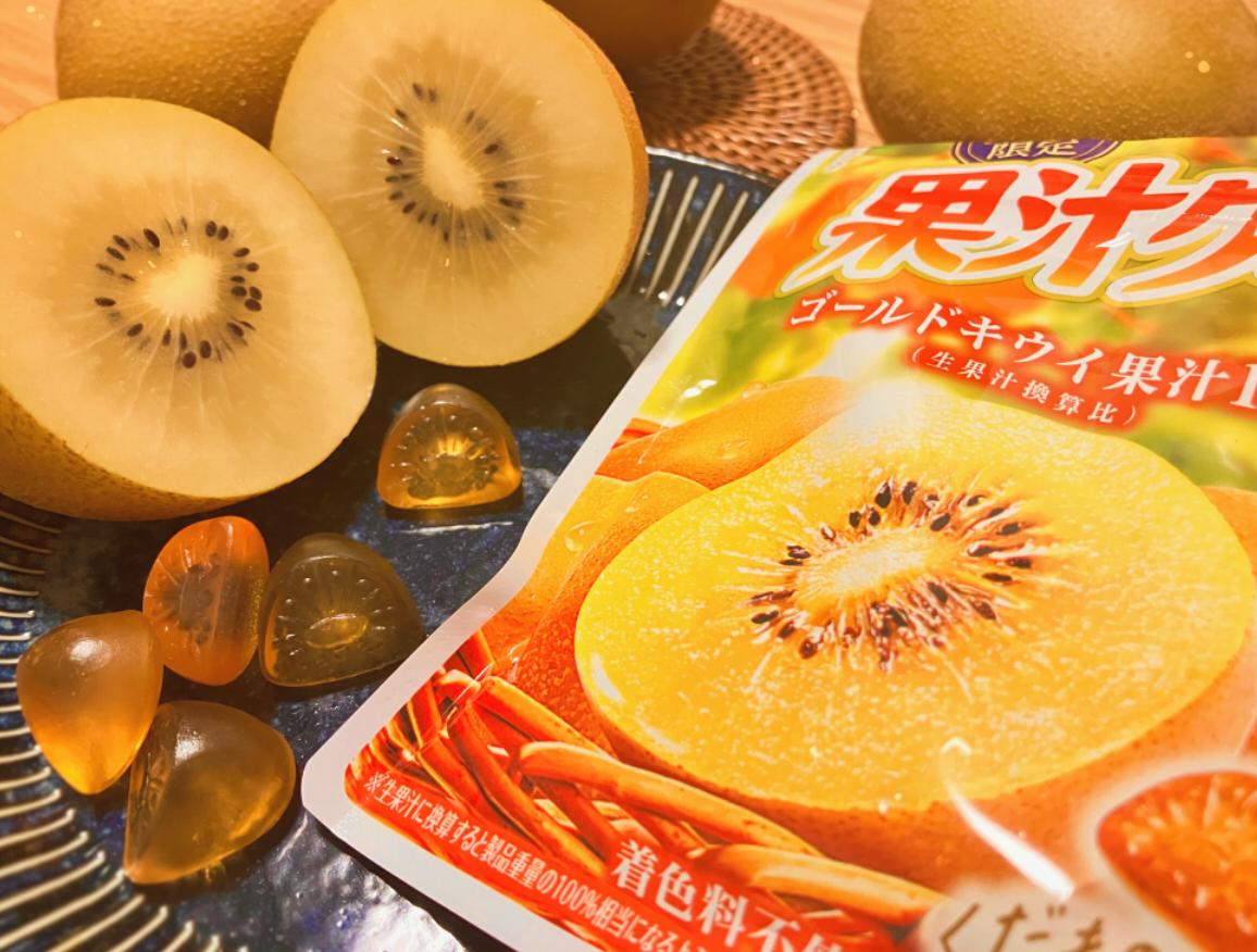 パッケージの色合いに目が惹きどんな味か試したく購入してみました。袋を開けた瞬間にゴールドキウイキウイの華やかな香りがふわっとしました。グミはぷにぷにの食感がよくて柔らかめグミ好きにはぴったりな食感です。ゴールドキウイは、グリーンキウイよりも、甘味が強くて酸味が少ないから食べやすいです。キウイの甘味が噛むたびにジュワジュワ溢れ出すようなジューシーさで美味しかったです。
