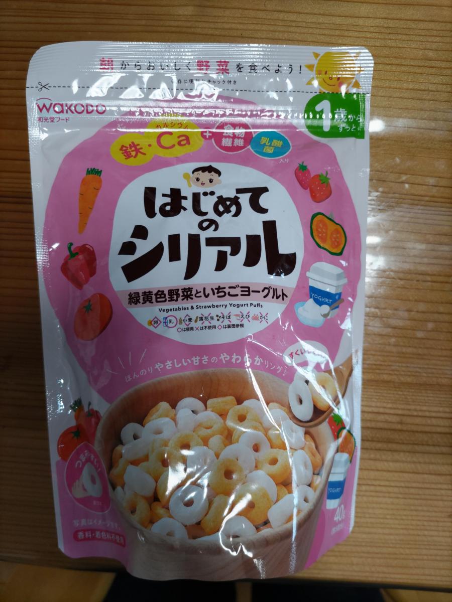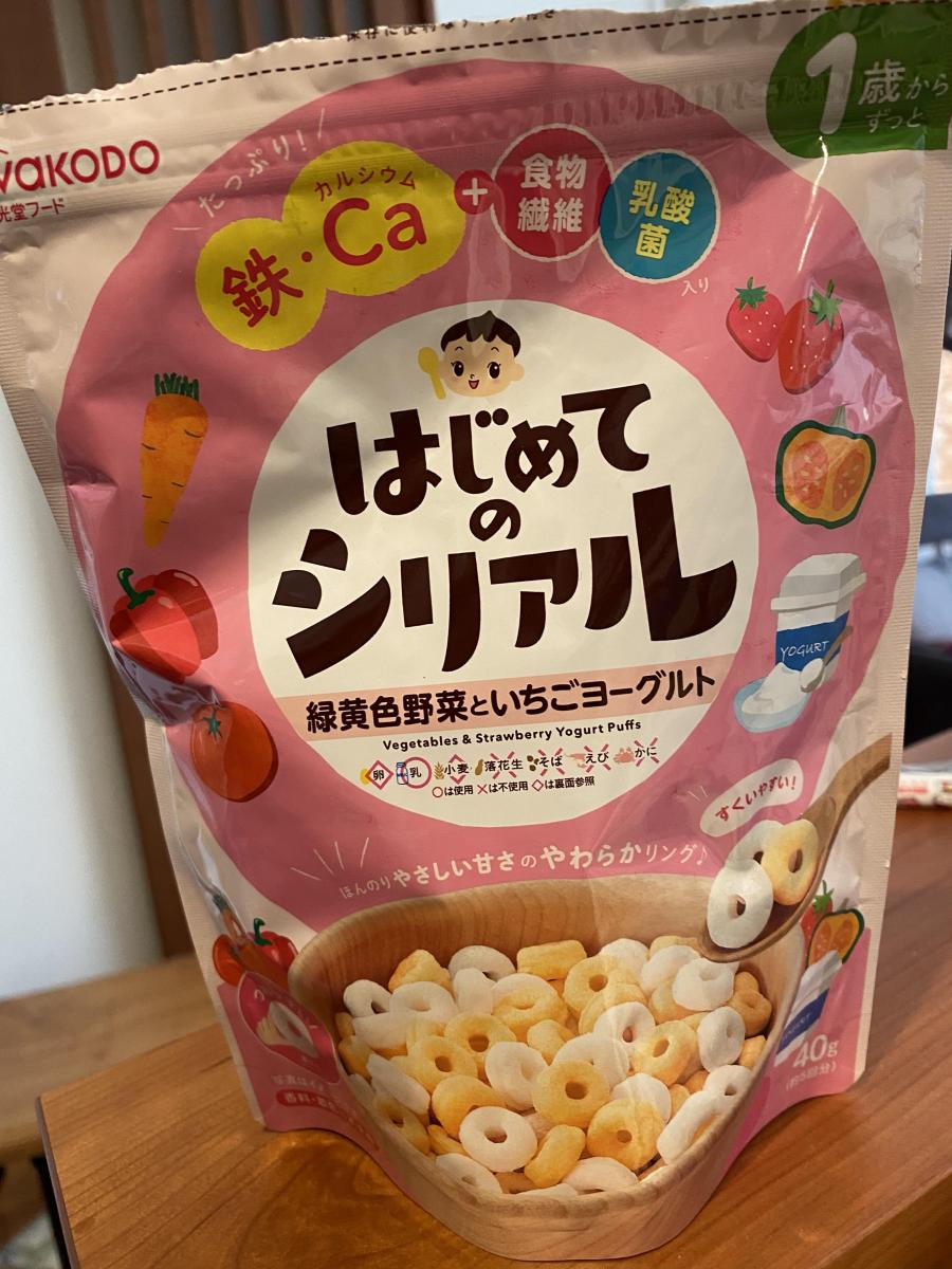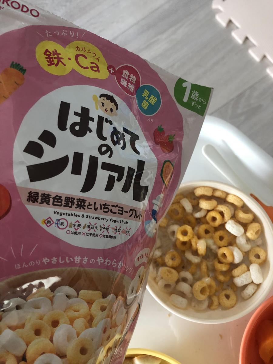 優しい甘さのシリアルです。野菜やヨーグルトが入っていて、鉄分やカルシウムも摂取できるところが魅力です。そのままお菓子のように食べたり、ヨーグルトに混ぜたりして、おやつに食べています。子どもがつまみやすい形をしているので、ひとりで上手に食べています。