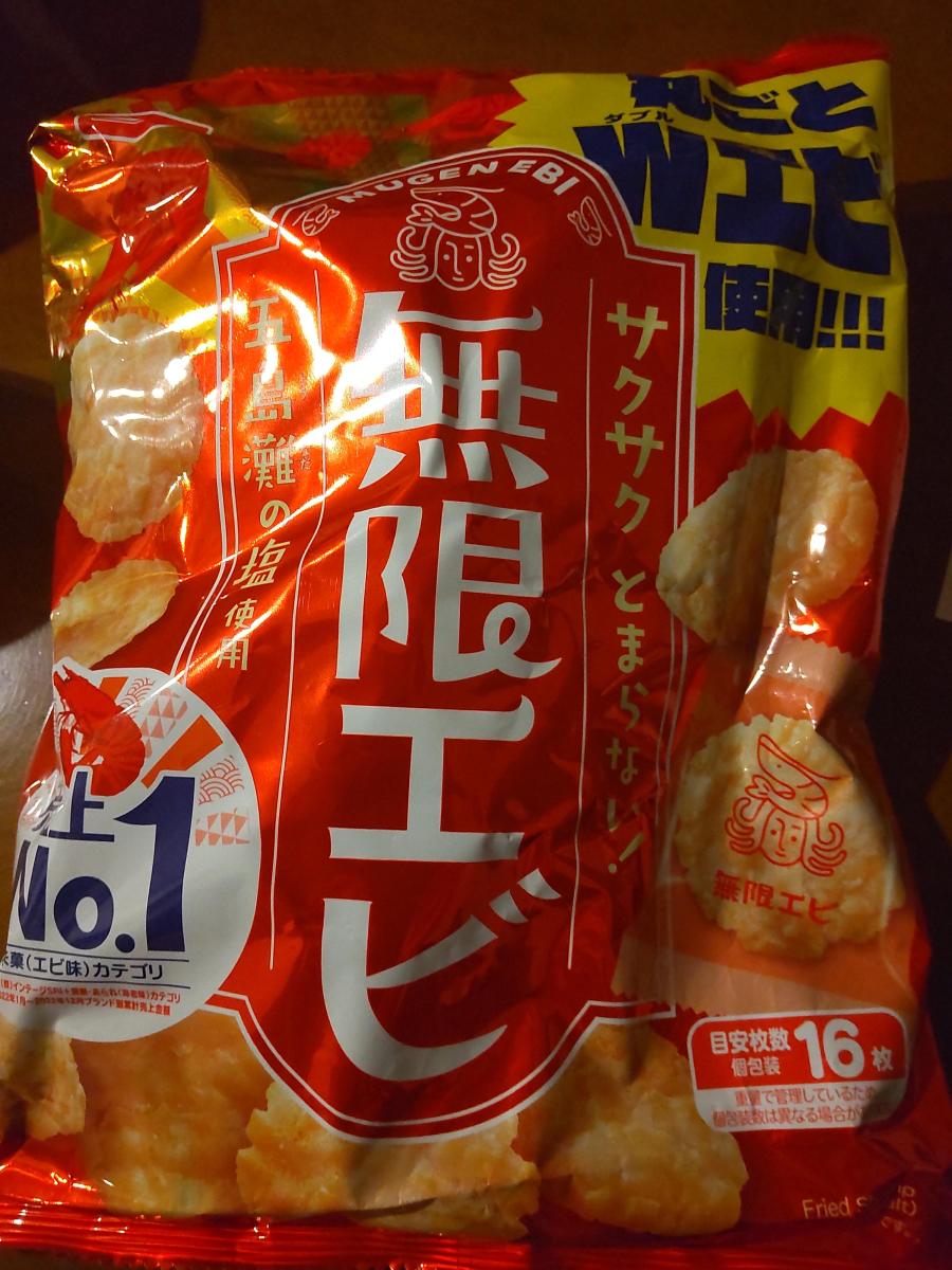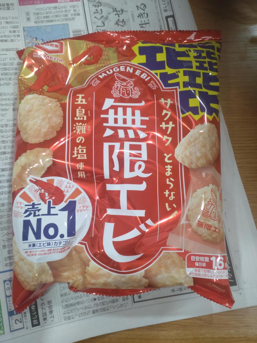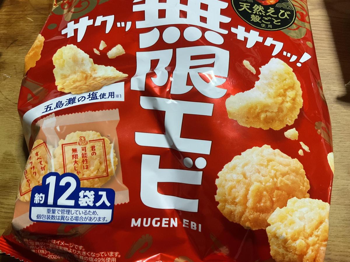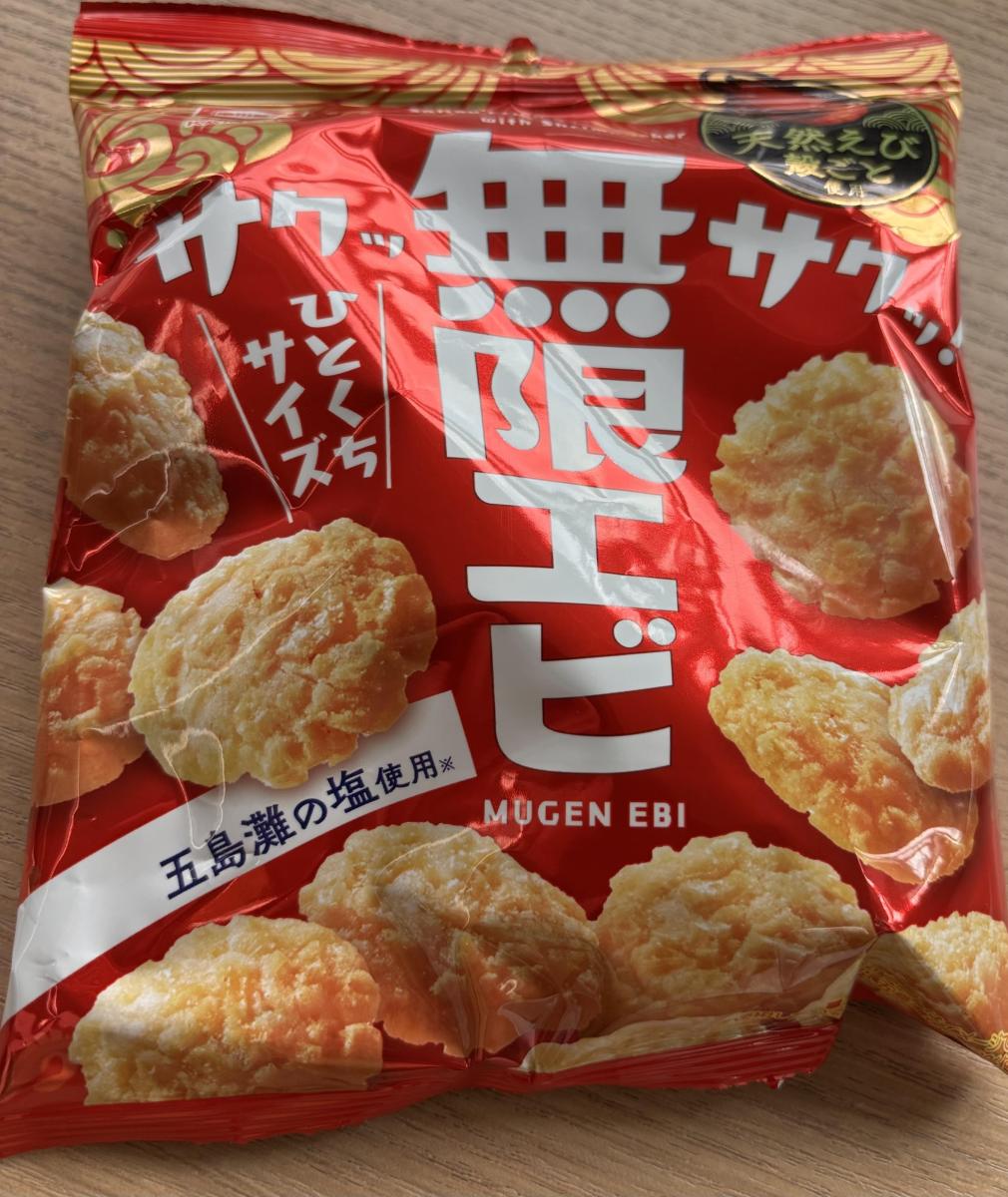 無限エビの名前のとおり、軽めのサクサクに結構な塩かげんで美味しいです。香ばしくて美味しいので食べ過ぎてしまいそうですが、塩辛い分のどが乾き過ぎて後で後悔します。食べ過ぎ注意で楽しみたいお菓子です。