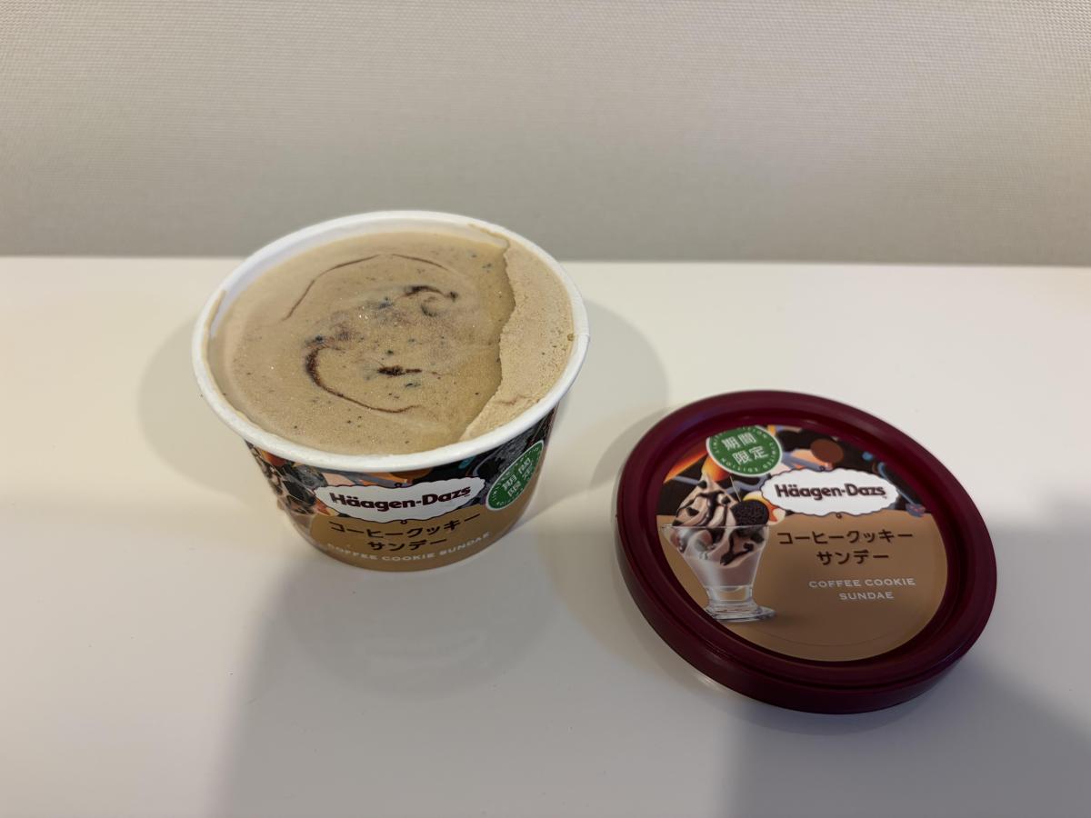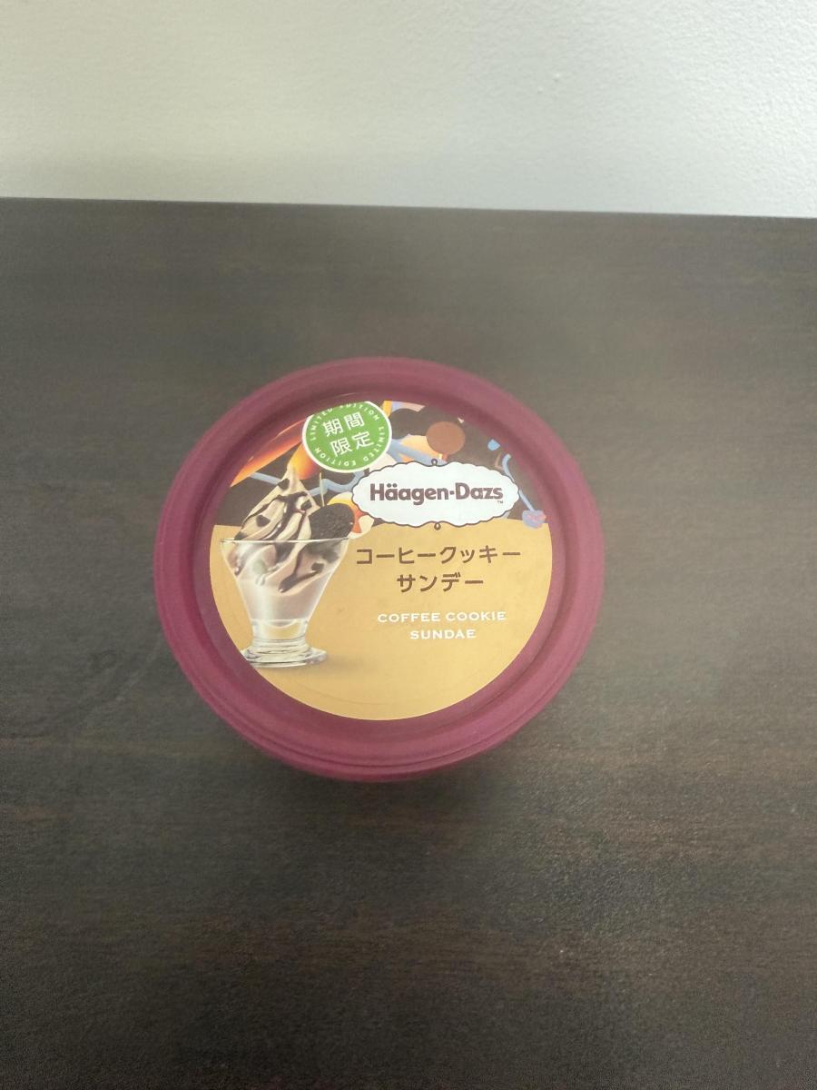 ハーゲンダッツ ミニカップ「コーヒークッキーサンデー」は、パッケージのおしゃれなサンデーの写真に惹かれて購入。ビターなコーヒーアイスにチョコクッキーと濃厚なチョコソースが絶妙にマッチし、サクサクの食感がアクセントになって飽きずに楽しめます。最後まで満足感たっぷりの贅沢なアイスです。
