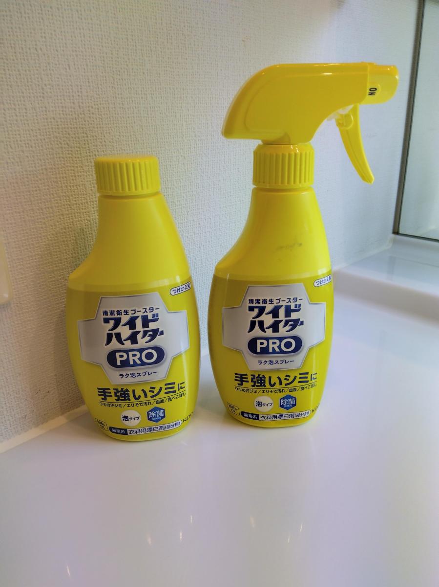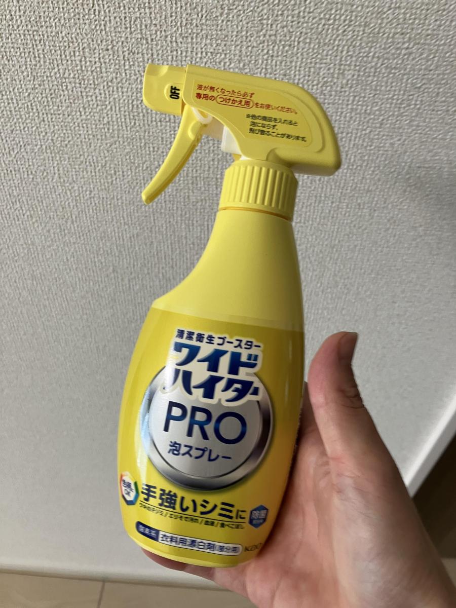 通常の洗濯に液体のワイドハイターを使っていますがこちらはスプレー状になっているのでえりや食べこぼしで汚れた部分に直接シュッとピンポイントに使うことができます。シャツについてしまったソースのシミも取れていて助かりました。色柄ものにも安心して使えるので1本あると万能に使えて便利だと思います。