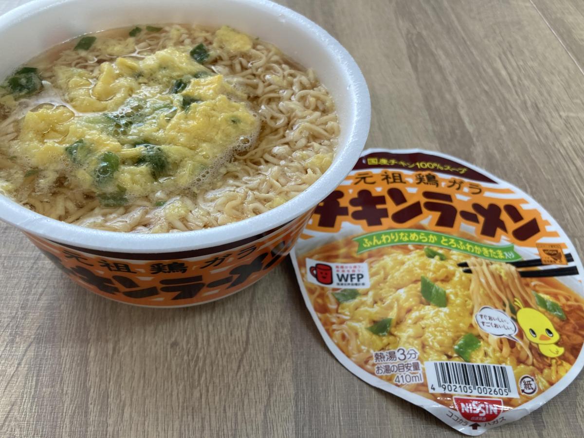 お湯を注いで3分待つだけでふわふわ卵入りのチキンラーメンが完成♪味も袋麺とほとんど変わらず美味しかったです。カップ麺の中ではカロリーもさほど高くないので小腹がすいたときにも食べやすいです。