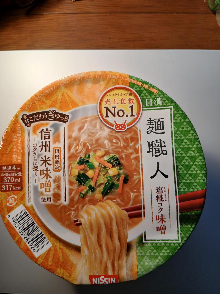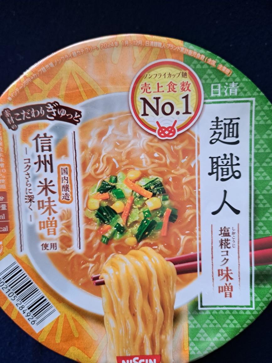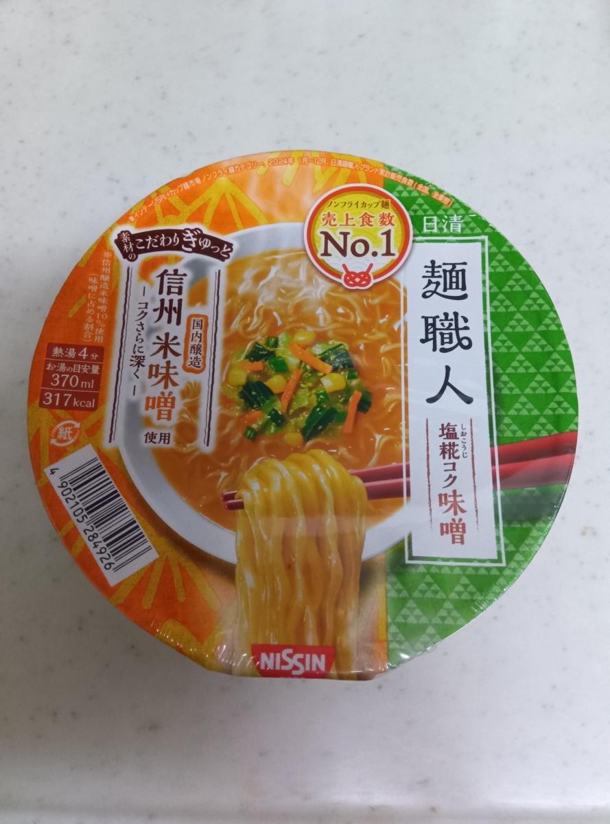 暑いのでちょっと迷いましたが特売されていてフタに塩糀コク味噌と記されていたのでどんなものかなと思って購入。スープはなるほど塩糀っぽさがあって味に影響しているのかコクはそれほどでもなくあっさりめで暑い中食べるのに良かったです。麺はノンフライの細麺で美味しい。具は野菜がそこそこの量入っていて彩りが良い。フタを開けた際にちょっと量が少ないのかなと思いましたが麺は65グラム入っていてお湯を入れてフタを再び開けると普通の量ありました。