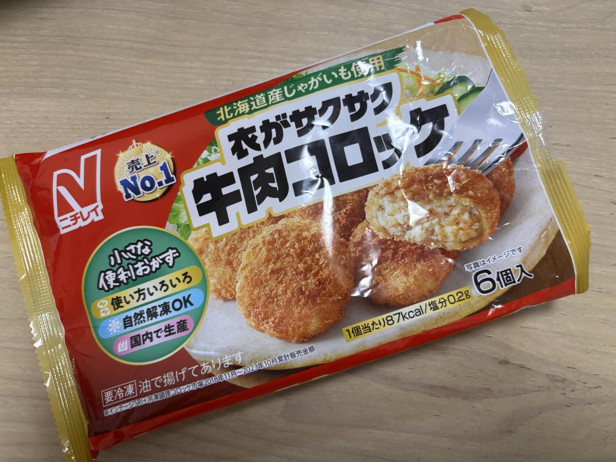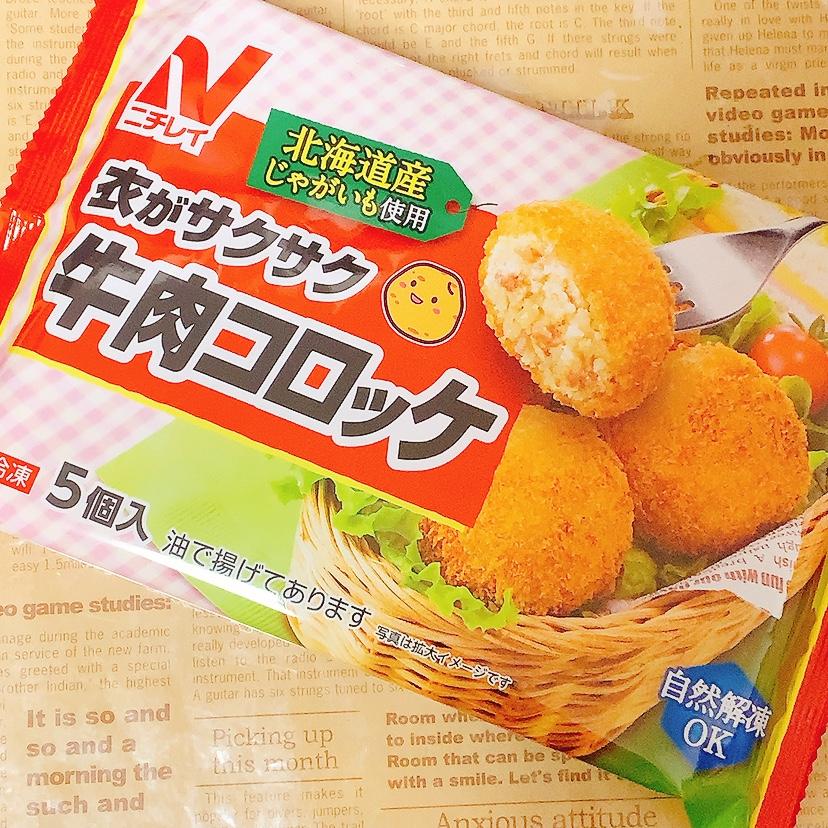 ニチレイの牛肉コロッケは小ぶりなサイズ感でお弁当に入れるのにちょうど良いです。牛肉の風味はほんのり感じる程度ですが、衣がサクサク、中のじゃがいもはトロッとしていて冷めても美味しいです。