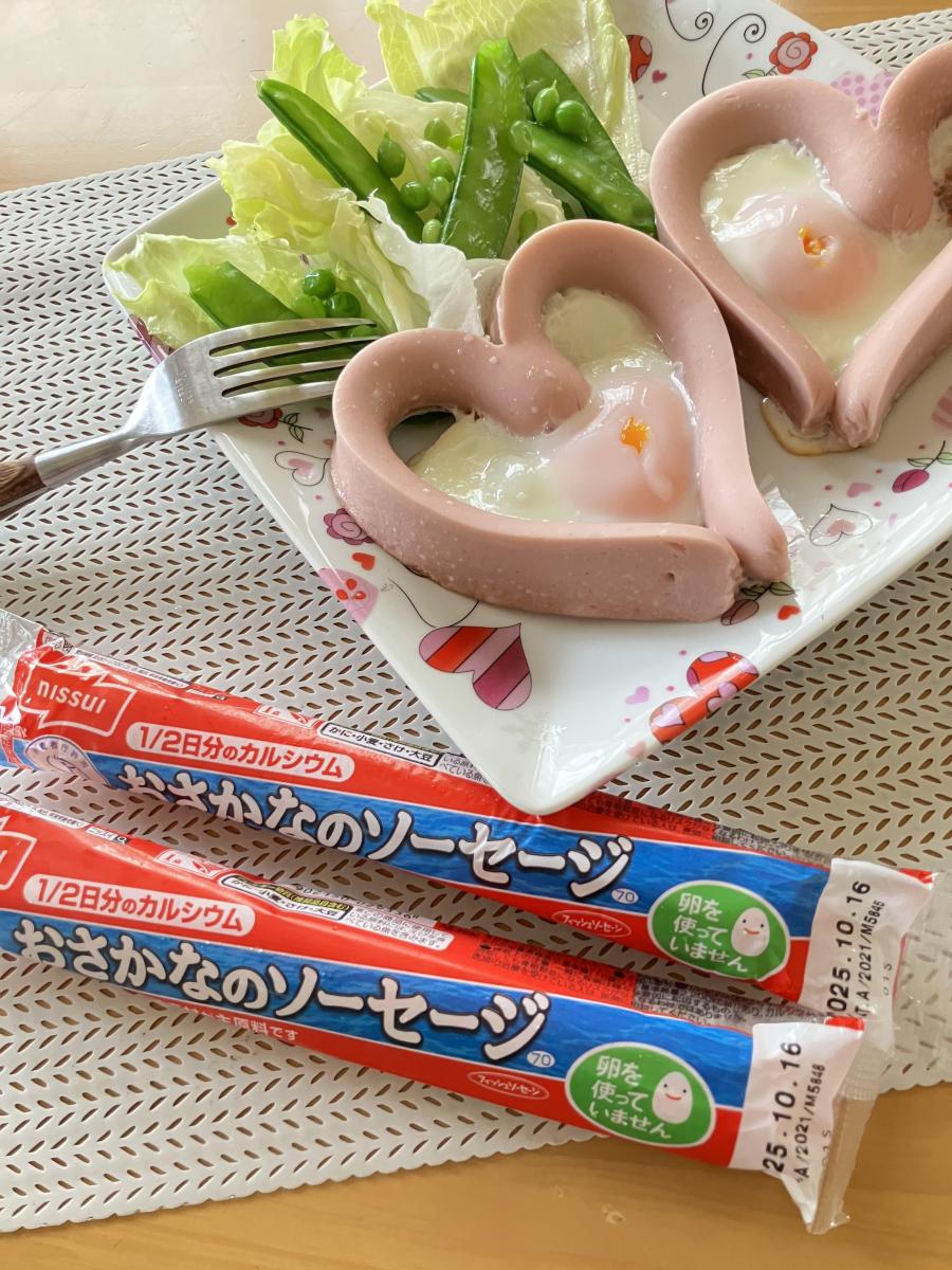 ソーセージを縦半分に1cmくらい残して切りくるっと丸めて楊枝で止めてハートの形に♡