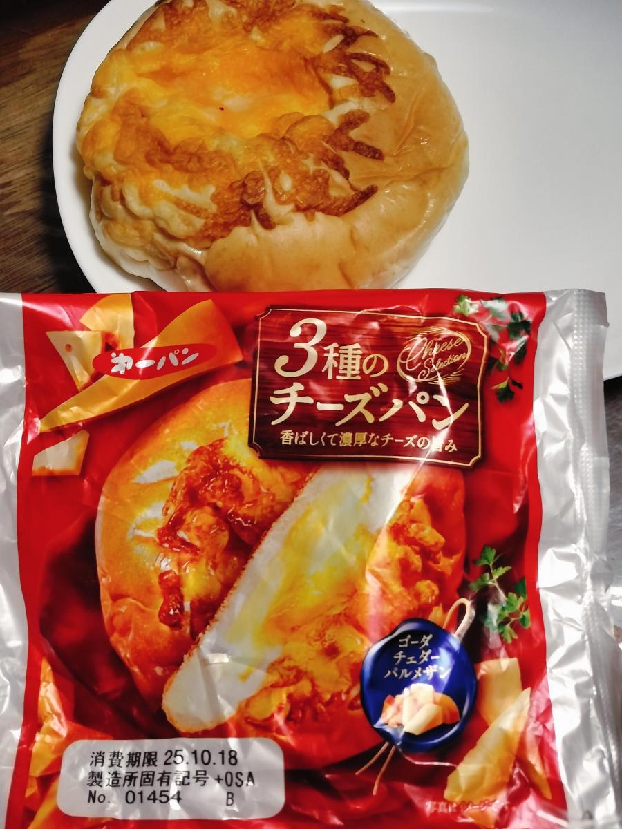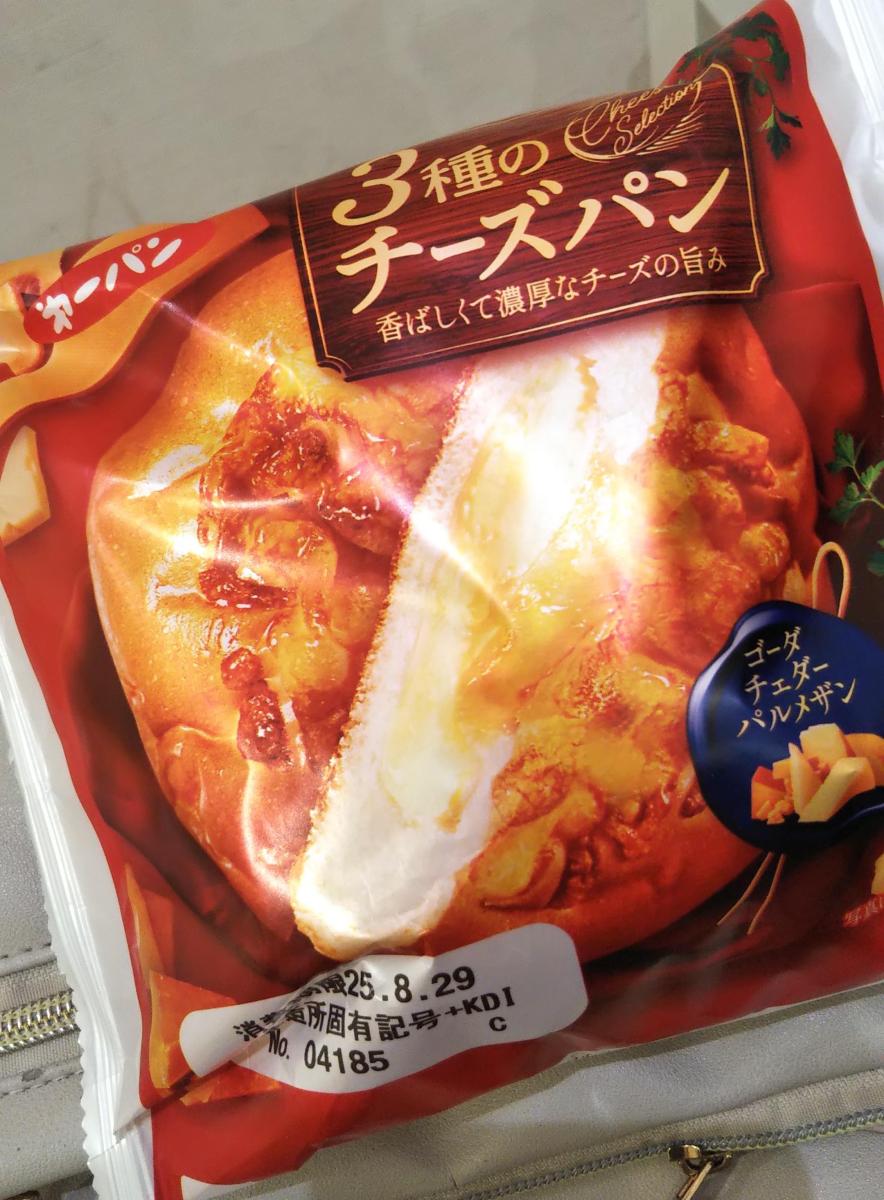 3種のチーズパンとチーズ好きにはなんとも食欲そそるネーミングだったので気になり購入してみました。袋から出すと結構大きなパンが出てきました。パンはふんわりしっとりしてました。上側には焼ききチーズがついておりチーズ味が濃厚でした。中にはチーズクリームが入っておりチーズ三昧でした。パンがもっとハード系だといいかな