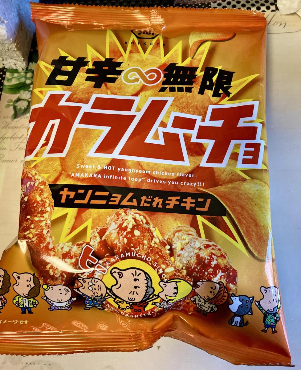 甘辛無限カラムーチョ ヤンニョムだれチキンのネーミングに惹かれてどんな味か試したく購入してみました。袋開けた瞬間から、ジャンキーな香りがたっぷりと感じました。薄めのチップスはパリパリサクサクで軽くていい食感です。甘さの後にピリリと辛い、甘辛味で、ほのかにチキンの旨みも感じ何だかクセになるような濃厚な味わいでした。おつまみにもぴったりな味わいだなと思います。