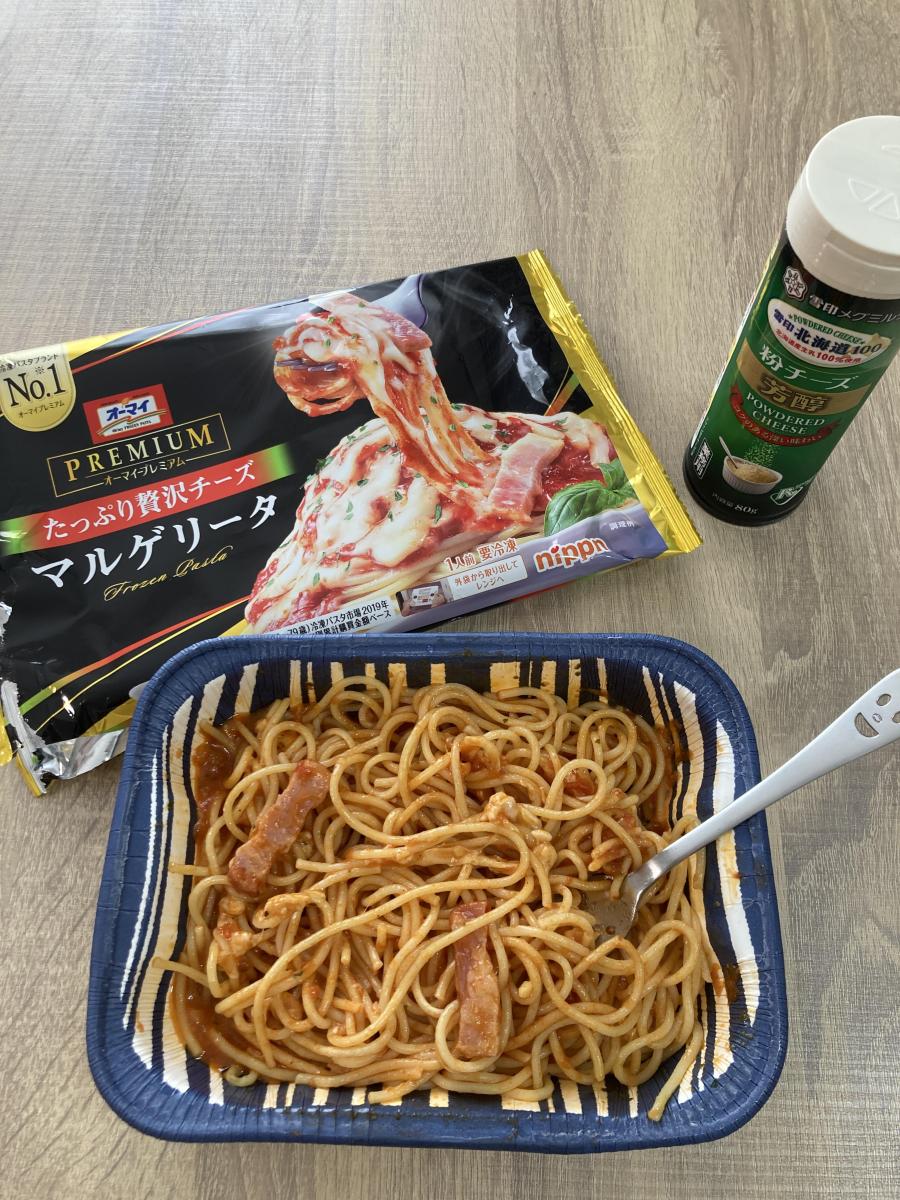 マルゲリータのパスタと聞いて斬新だと思い購入しました。オーマイさんはレンジでチーンするだけでお皿入らずなのが嬉しいです。とろーり伸びるチーズがトマトソースと麺に絡んで最高でした。ただ、時間がたつとチーズがどんどん固まっていき麺同士がひっついて団子のようになったところが残念でした。それ以外はトマトソースの酸味もちょうどよく、バジルのパンチがよくきいていて美味しいです。バジルがあるのとないのとでは全然違いますね。
