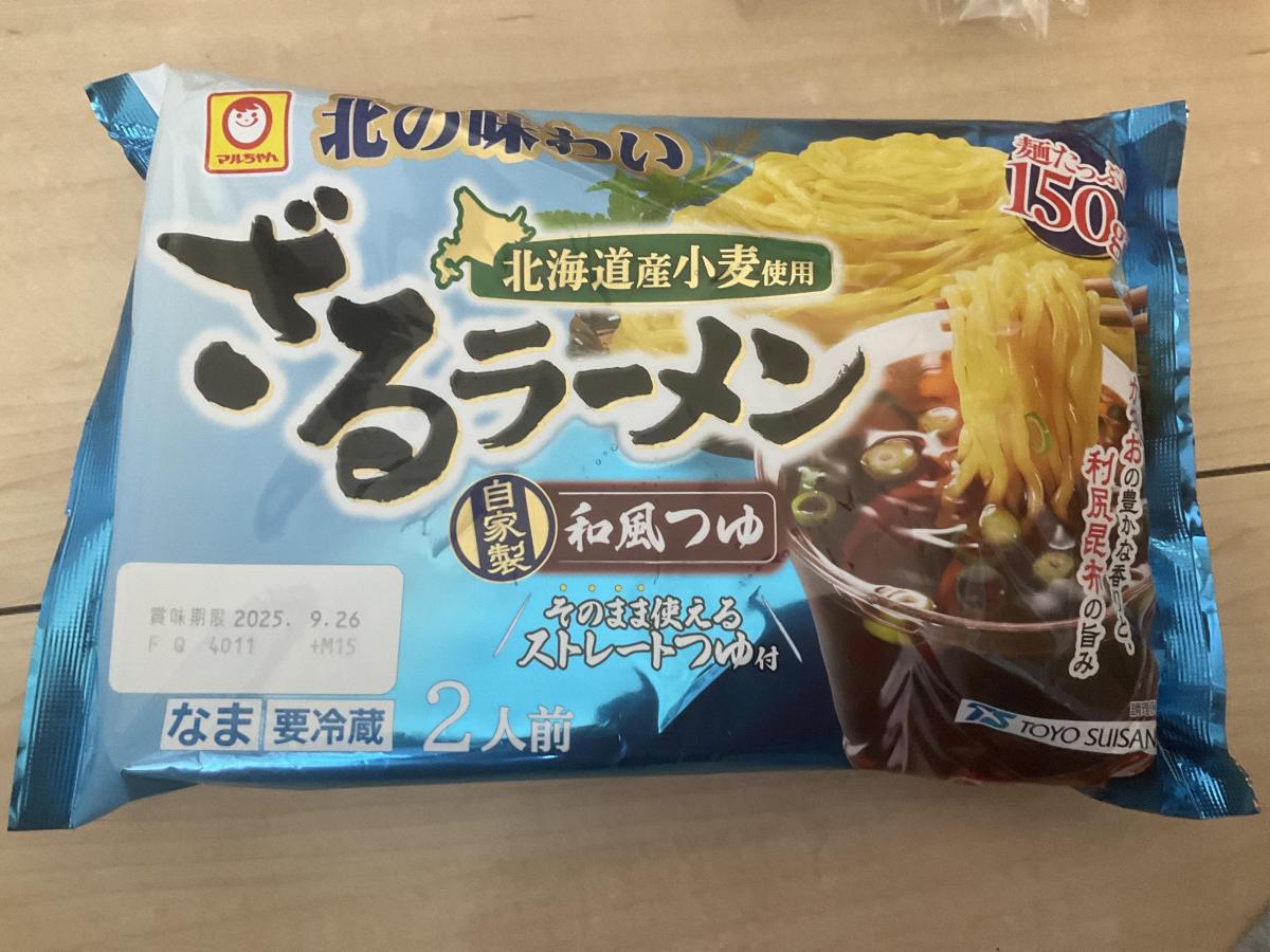 まだまだ暑い日々が続いていたので、チルド麺売り場で選んでいて美味しそうに見えたざるラーメン!!です。パッケージの全面が涼しげなブルーの色合いで、中央のざる麺とつゆが冷ややかでとっても美味しそうに見えました。