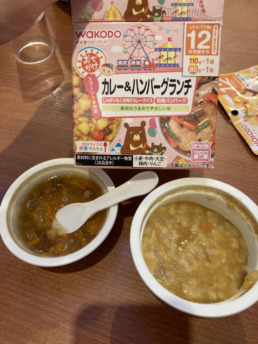 また、カレーにハンバーグの組み合わせは子供も大好きな組み合わせで、特別感があって外出時ならではの離乳食です。
