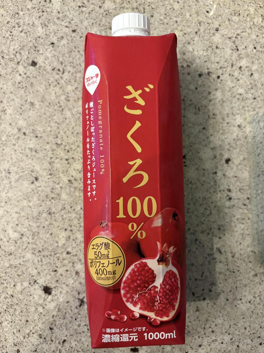 ざくろは体にいいと言われるので、以前高級スーパーで100%ジュースを購入して時々飲んでいました。今回こちらを近所のスーパーで見かけ、ざくろ100%のジュースが普通のスーパーで売っていることが珍しいのと、大手のスジャータから出ていることに驚いて購入してみました。1L入りで500円ちょっとでしたので、他のざくろ100%ジュースよりもだいぶお手頃だと思いました。
