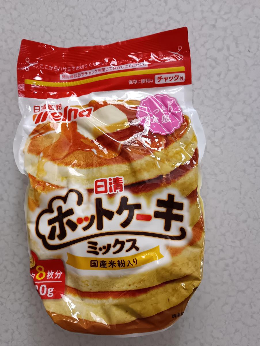 ホットケーキミックスは色々な種類を使って食べましたが、この日清のホットケーキミックスは最近の中では特に気に入っている粉です。国産米粉入りとパッケージに書いてあって小麦粉だけのミックスと違って、生地の食感がモチモチしています。