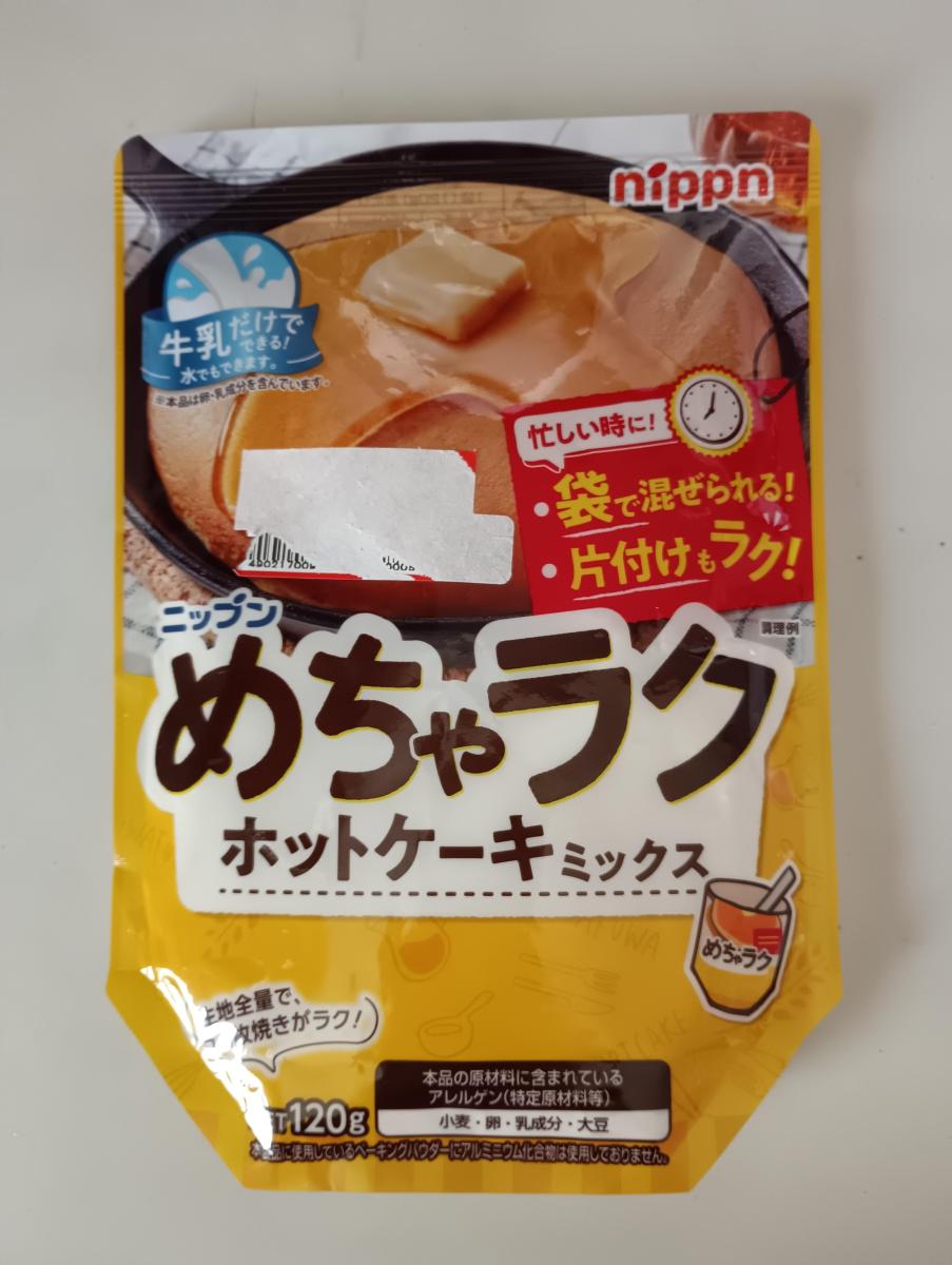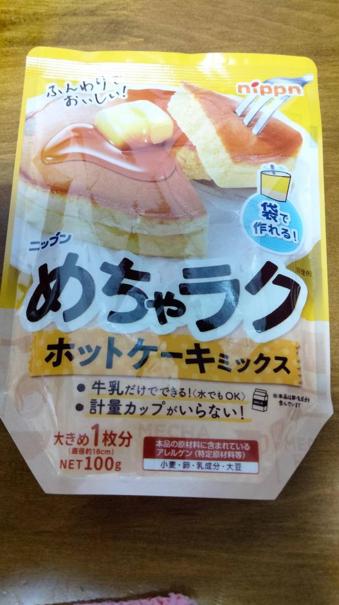 お得になっていた商品コーナーで見つけました。めちゃラクというフレーズが気になって購入しました。ハサミで袋を切って、牛乳を入れて混ぜるというのがメインの商品です。今回は牛乳が残り少ない為、水を使って作りました。こちらの商品のめちゃラクな部分はボウル、泡だて器を使わない…つまり洗い物が減らせる事。そして材料をそれぞれに計量しなくてよいという事。混ぜたら、温めたフライパンに直行なので良いですね。調理して思ったのです。袋が割と硬めにしている素材ですが、ふにゃふにゃして混ぜにくいです。1人で作るより子供が手伝って袋を支える必要があります。水をいれたら、混ぜていると、気泡がブツブツ、だまになってもOKとはいえ、全工程スプーンはおすすめ出来ません。袋の構造はきちんと考えられているのですが、四隅に粉が残るし、混ぜるのに使ったスプーンがだまになっていたと気付いたのが、フライパンに生地を流した後でした。お箸の方が良いかもしれません。フライパンで焼く工程は美味しそうに出来ます。食べてみると、ふんわりした優しい生地で、甘さはある方ですが、美味しくいただきました。親子で楽しく作りたい時はおすすめです。