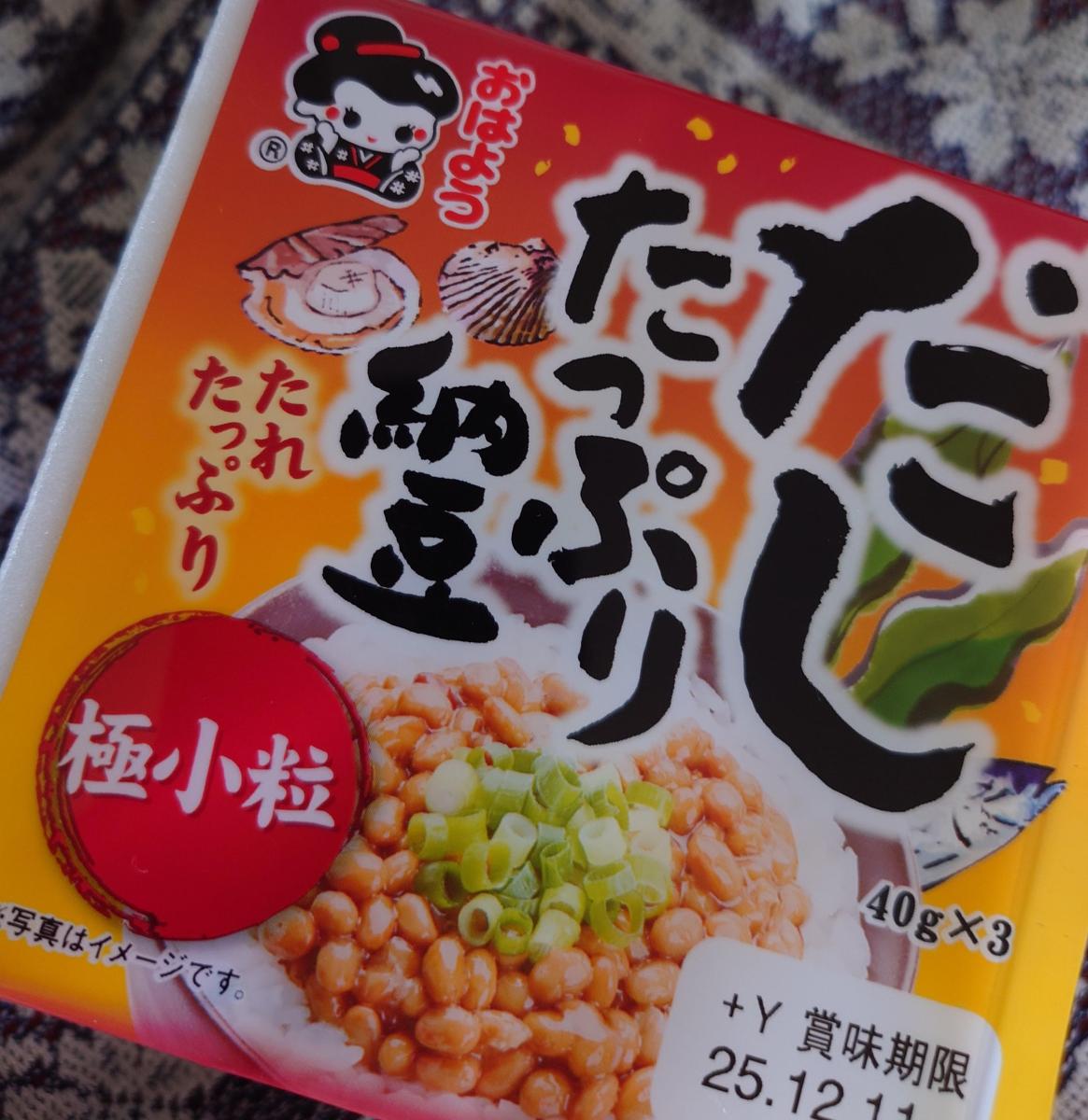 たれがたっぷりとしていて、からしは付いていないです。ふわっとねばり、納豆は小粒で、クセが強くなくておいしいです。やや冷めたご飯に合うくらいに、だしの旨味がするので、お弁当の白いご飯に合わせることもできます。特別な感じはなく、日常的においしくいただけます。