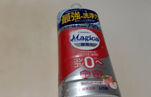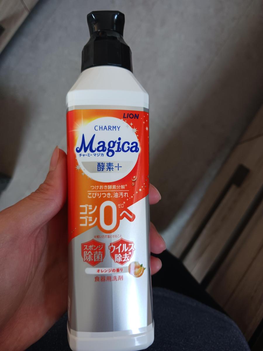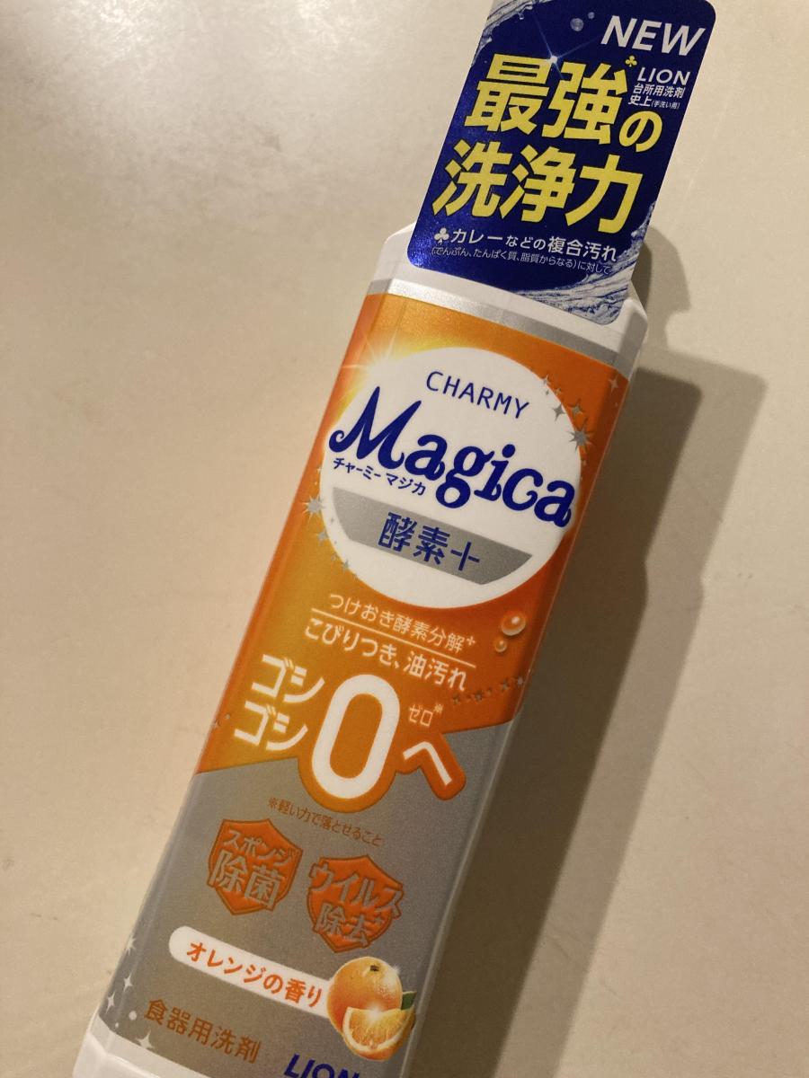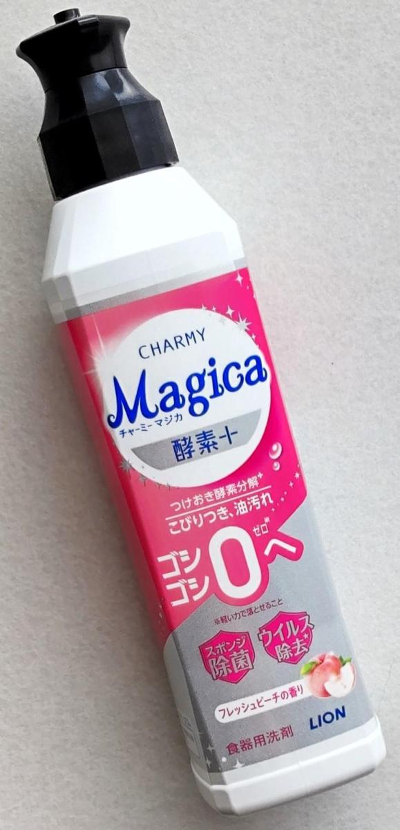 台所洗剤はジョイとキュキュットの2強というイメージ。マジカはよく分からない印象で手を出しにくかったのですが、チャーミーの後継だと気づいて買ってみました。少量でもちゃんと泡立ち洗浄力も申し分ありません。油汚れに強く除菌のジョイ、泡切れよいキュキュット、抜きんでた特徴は感じられなかったので手を出しにくかったマジカですがさらっとしているのに酵素のチカラでこびりついた汚れがすぐ落ちる。チャーミーが進化した魔法のような洗浄力に偽りなし。やさしい泡と共にふわっと香る癒しのピーチに洗い物をする気持ちもふわっと軽くなります。やっぱりマジカはチャーミーの後継、心温まるチャーミーグリーンの手つなぎCMを懐かしく思い出しました。