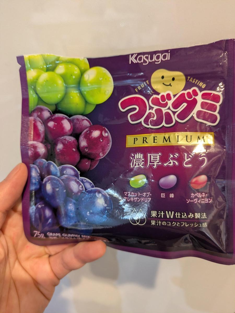 ブドウ味のプレミアムという事で期待して頂きました。どこら辺がプレミアムなのか分かりずらい商品です。小粒なのでオフィスでも小腹が空いた時に食べやすくて良いです。表面の糖衣を噛んだら味はしますが糖衣が砕けた後は味があまりしなかったです。