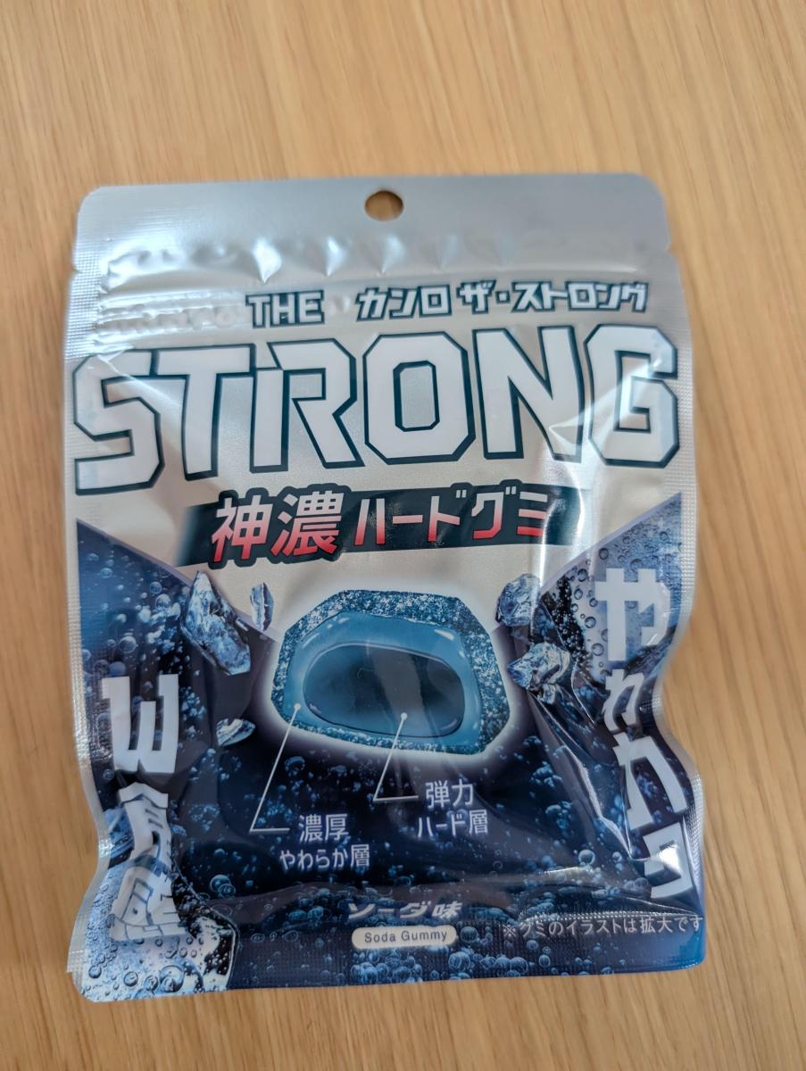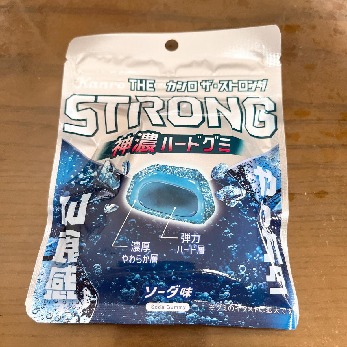 見た目青い石ころ…みたいです。噛むとさすがストロング!!外側はソフトなグミですが中身はハード!!強い弾力が気持ちいいくらいです。噛みごたえがいいのでソーダの味わいも爽快にきます。気分転換にもいいグミですねー。