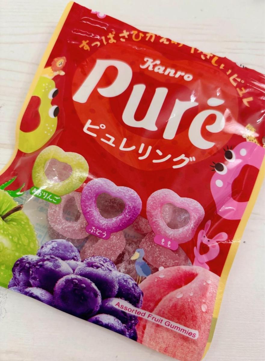 酸っぱさと甘さのバランスが絶妙で、弾力のある食感がクセになる!果実感もしっかりあって、リング型の見た目もかわいく食べやすい。ピュレグミならではのねっとり食感はありつつ、いつもに比べて周りのパウダーのすっぱさひかえめで、リングになってることでやや硬めのベタつかないもっちり感。