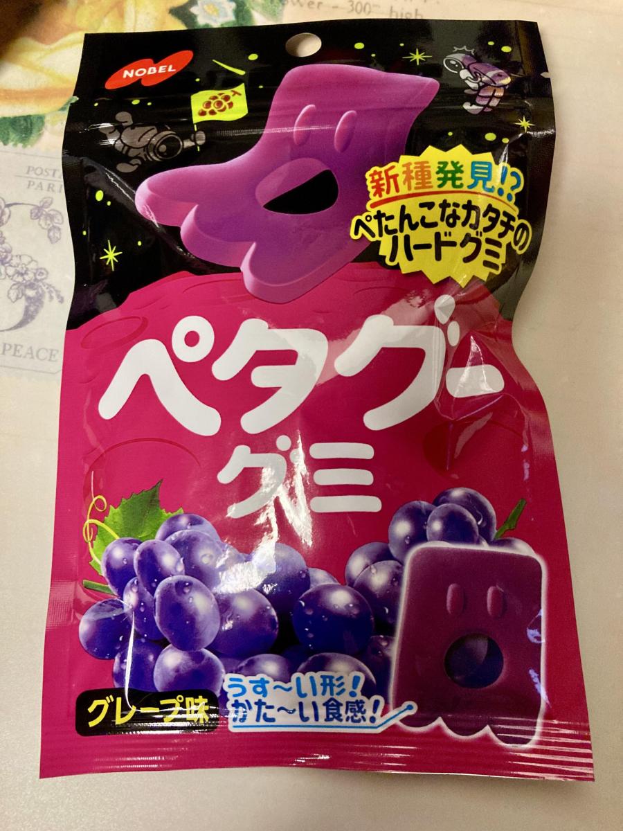 前から気になっていたペタグーグミ。娘に最後の1枚もらいました。大きさはぺたんこだけど大きめ。想像していたより硬めのハードグミ。グレープの味がちゃんとして美味しい。これはリピしたいです。