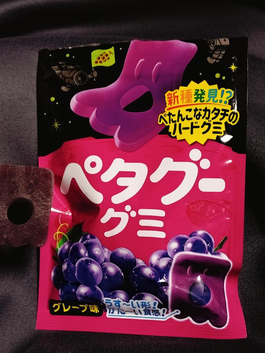 ペタグーグミをあまり食べた事がなかったので気になり購入してみました。結構濃いめの色合いで、顔がよくわからないほどでした。薄いのにすごく噛みごたえがあるようなハードな食感で、中々なくなりません、、ジューシーさもありますが、人工的なグレープ味で、酸味もなく甘さがたっぷりとあり何より、味がイマイチかな。硬いグミが好きな方は良いと思います。