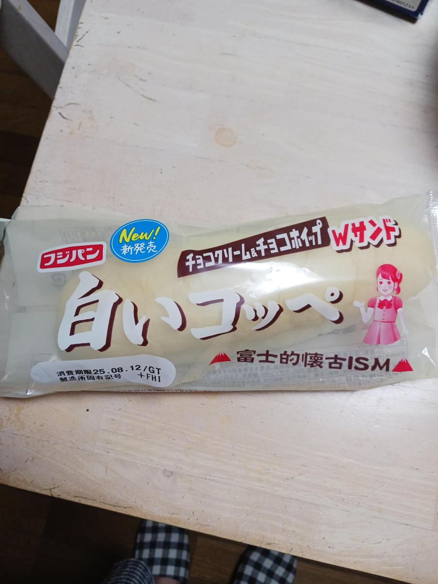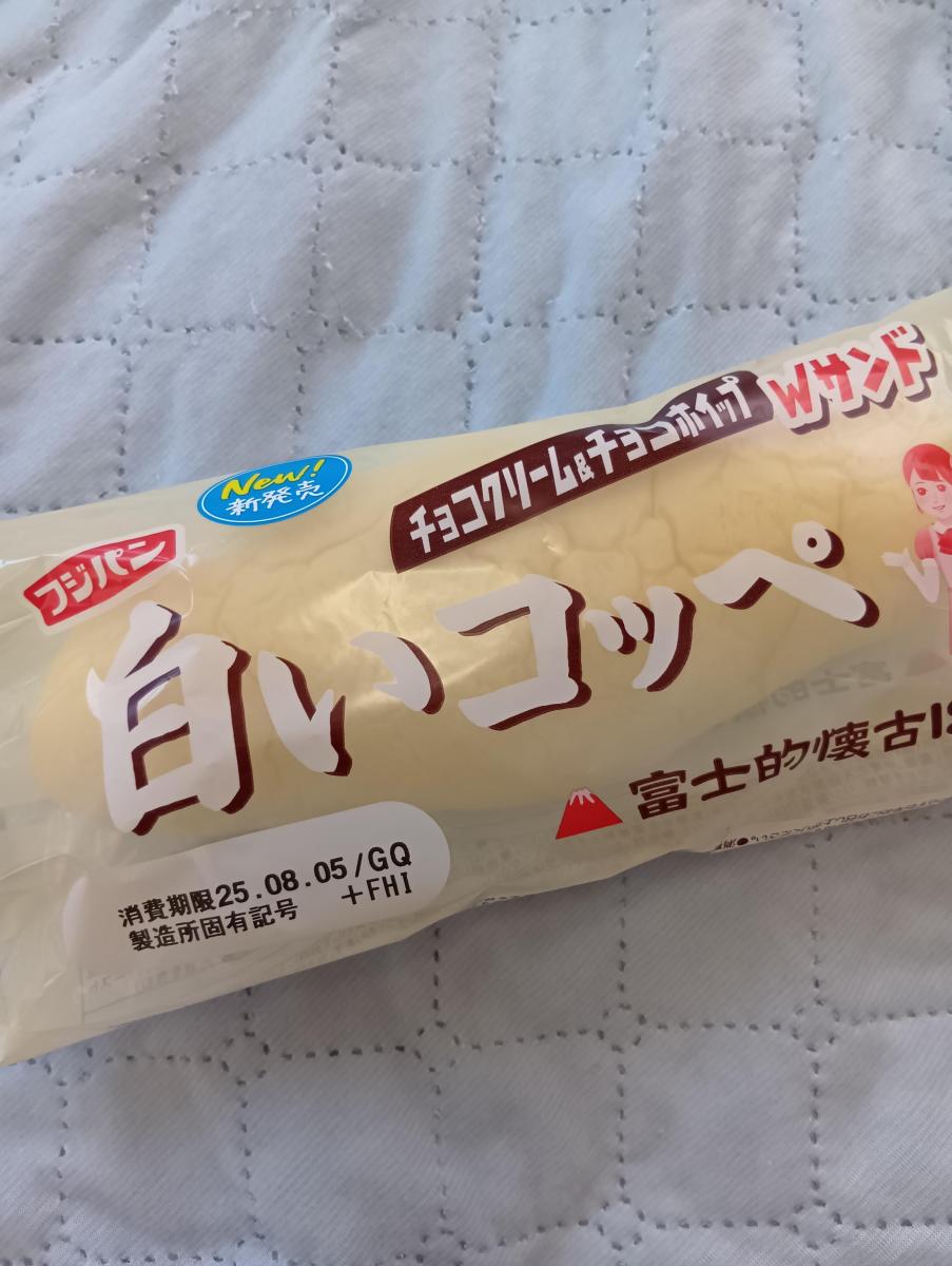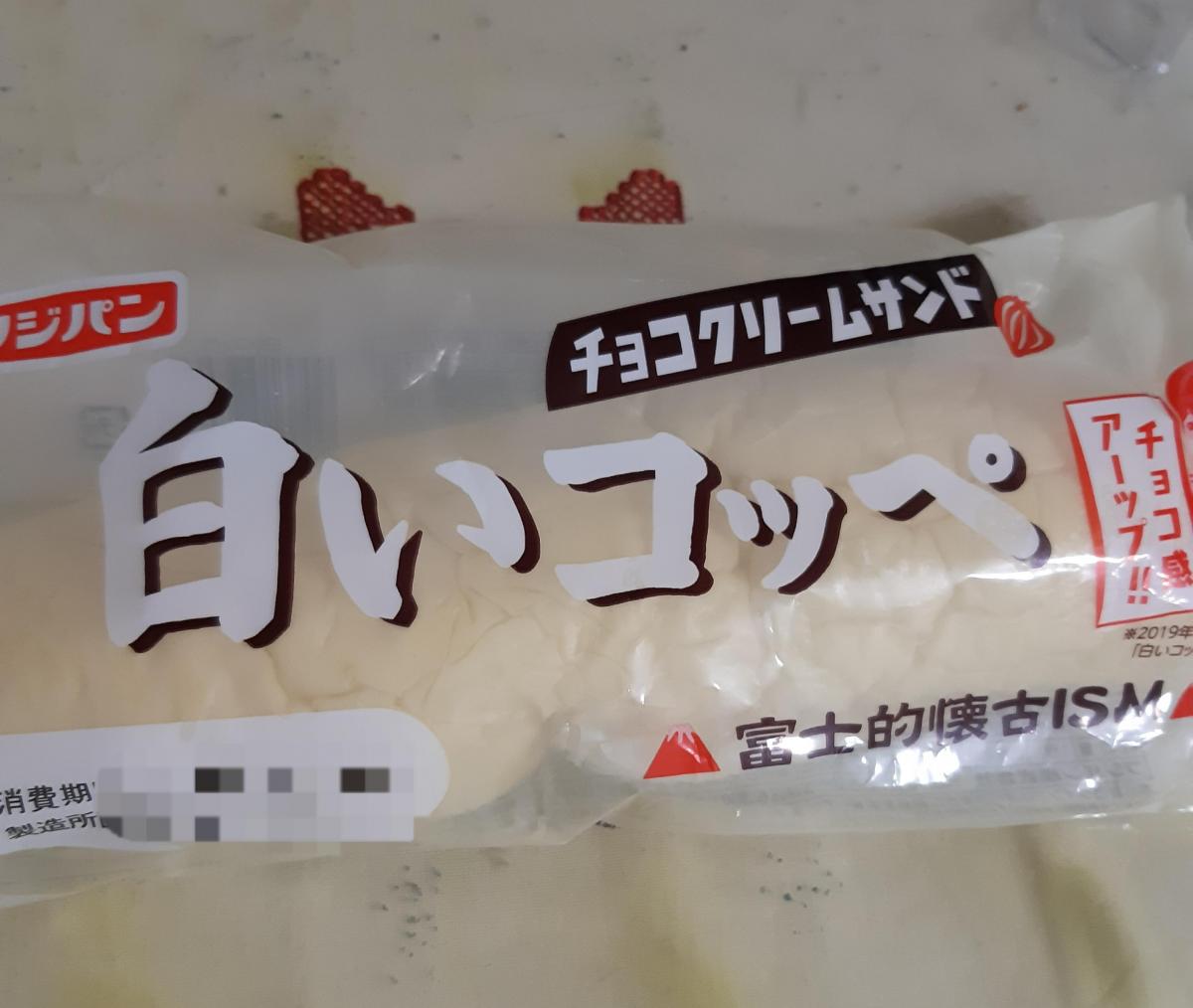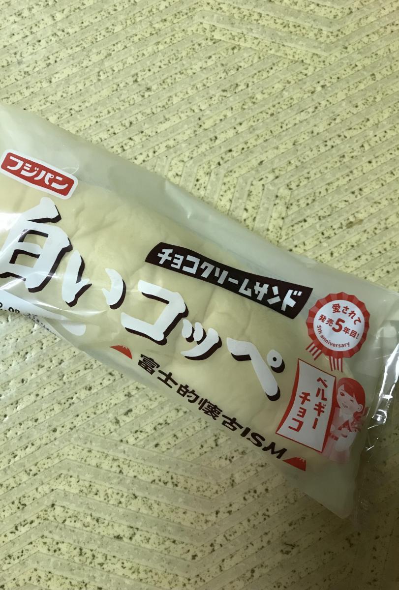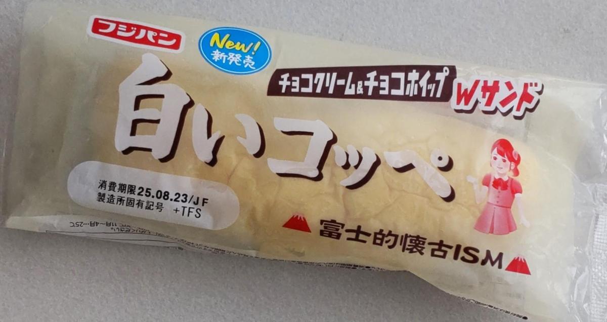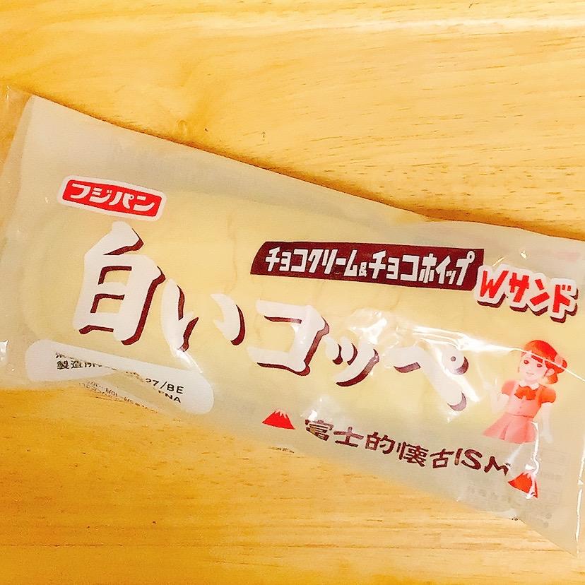 ヤマザキはたまに見かけるけど、フジパンの白いコッペパンは初めて。パンの表面が袋にくっついているくらいペタペタ。しっとりしながらも、香ばしさをちゃんと感じられておいしい。もっちりと柔らかいパンにチョコホイップとチョコレートスプレッドが塗られています。甘いチョコスプレッドが軽やかなチョコホイップをガナッシュみたいに感じさせてくれるのがいい。ところで富士的懐古ISMとありますが、昭和以前にこんなもっちりとした白パン、日本にあったんでしょうか?パッケージの女の子がレトロかわいいから、まっいっか。