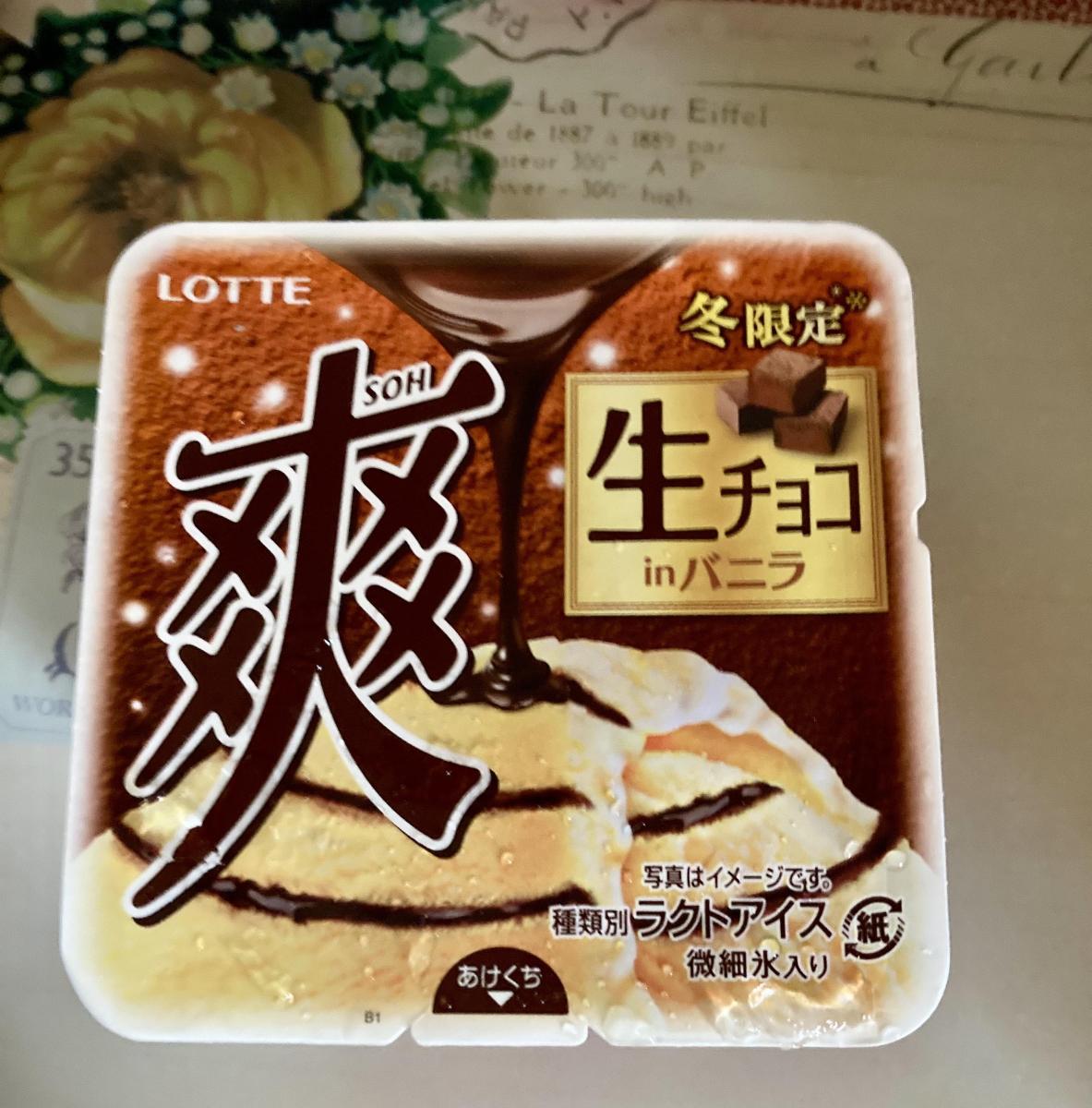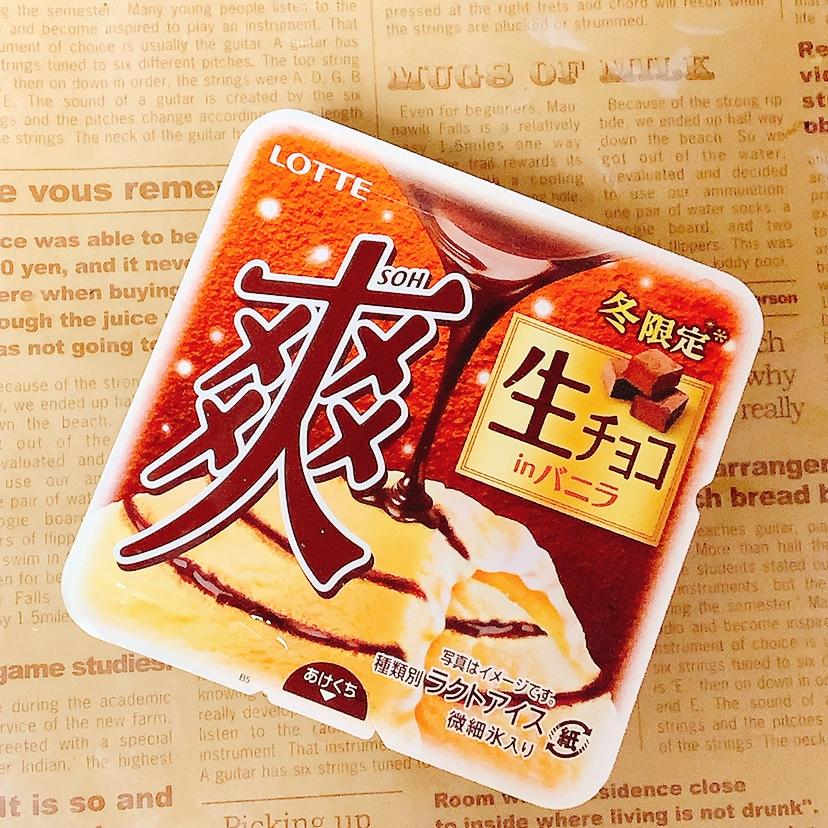 生チョコと言うと、もったり濃厚でまとわりつくような後味をイメージしますが、爽の生チョコは爽の良さをいかした、後味はすっきりな生チョコ風味に仕上がっていました。すっきりしているけど、バニラと生チョコの味わいはしっかり濃厚。新感覚でした。