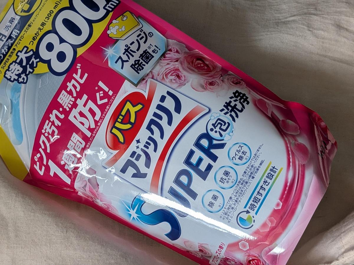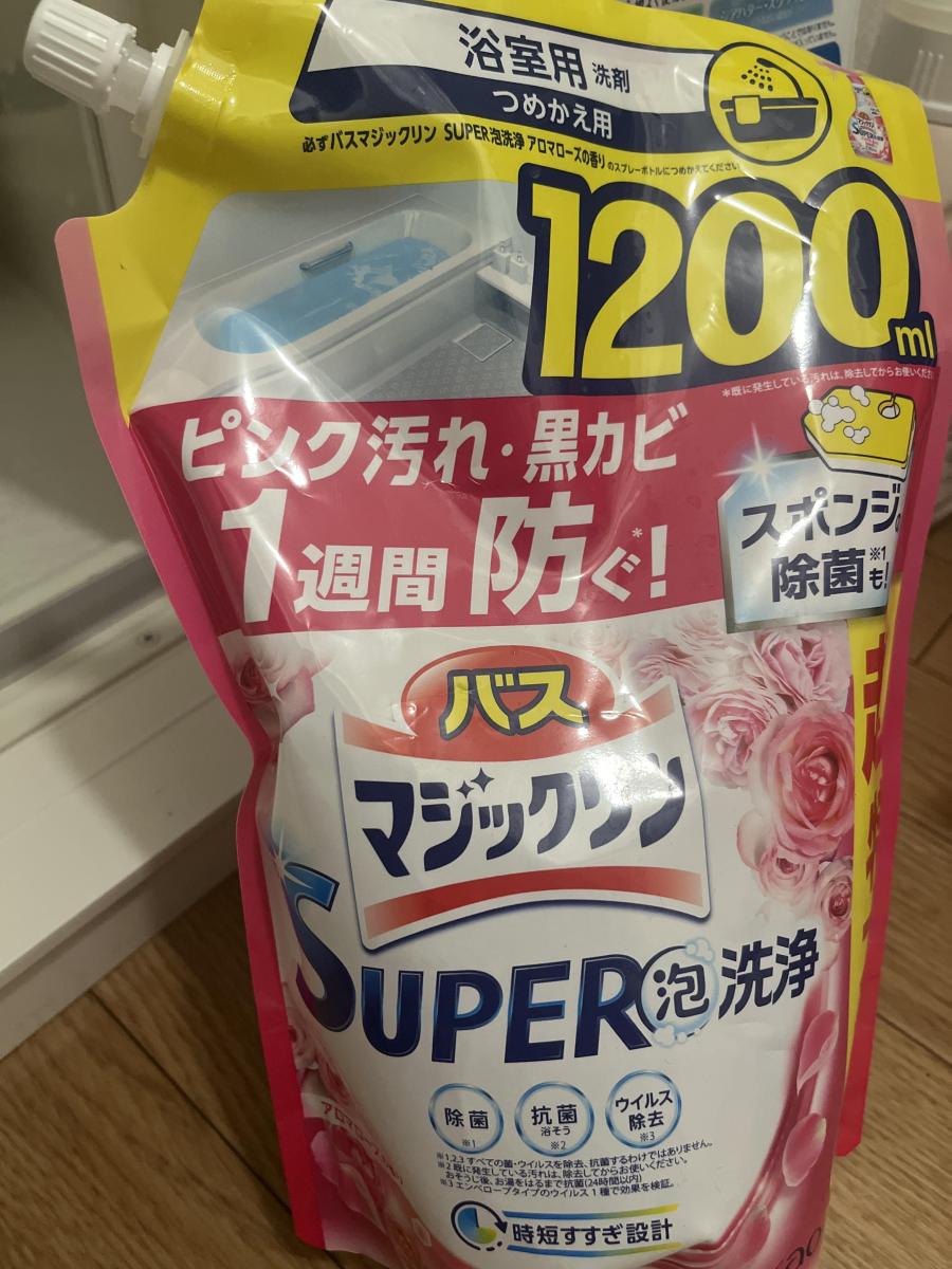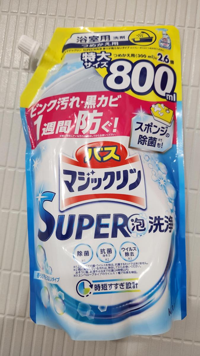 マジックリンの、名前にスーパーがついているので期待して購入しました。浴槽、壁、かがみ、あらゆるところにふりかけてスポンジでこすり、シャワーで流すとお見事!ツルツルになります。洗浄力はしっかりあると思います。また、泡切れもよく掃除しやすかったです。除菌、抗菌、ウイルス除去までしてくれるとのことで、安心して使用しています。