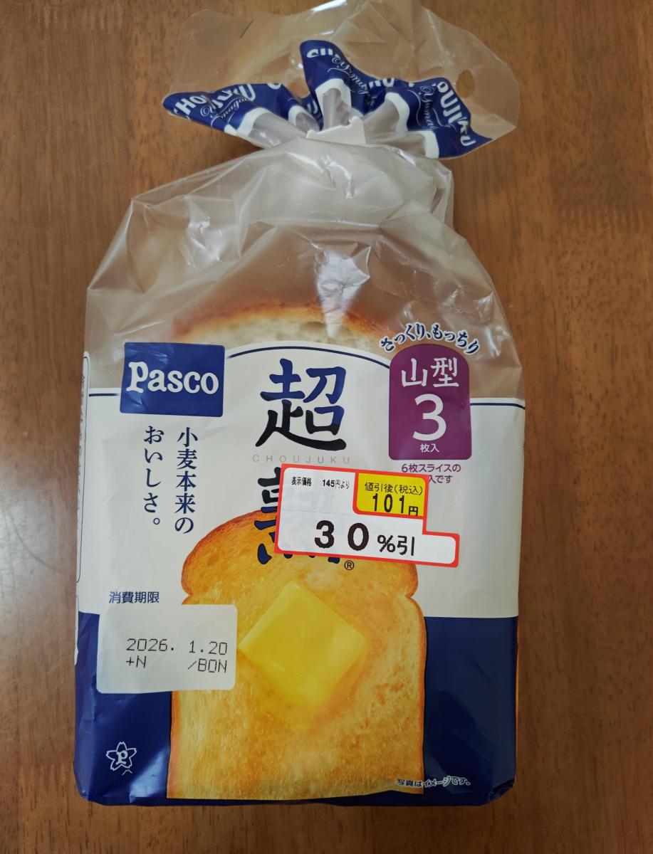 超熟のなかでもイチバン好きな山型パンです。よけいな添加物がはいってなくて安心して食べられます。美味しくて大好きだけど、ちょっと値段もいいのでふだんあまり買えないので、特売してたら必ず買うようにしてます。トーストしてたっぷりバターと蜂蜜で食べるのが至福の時です。