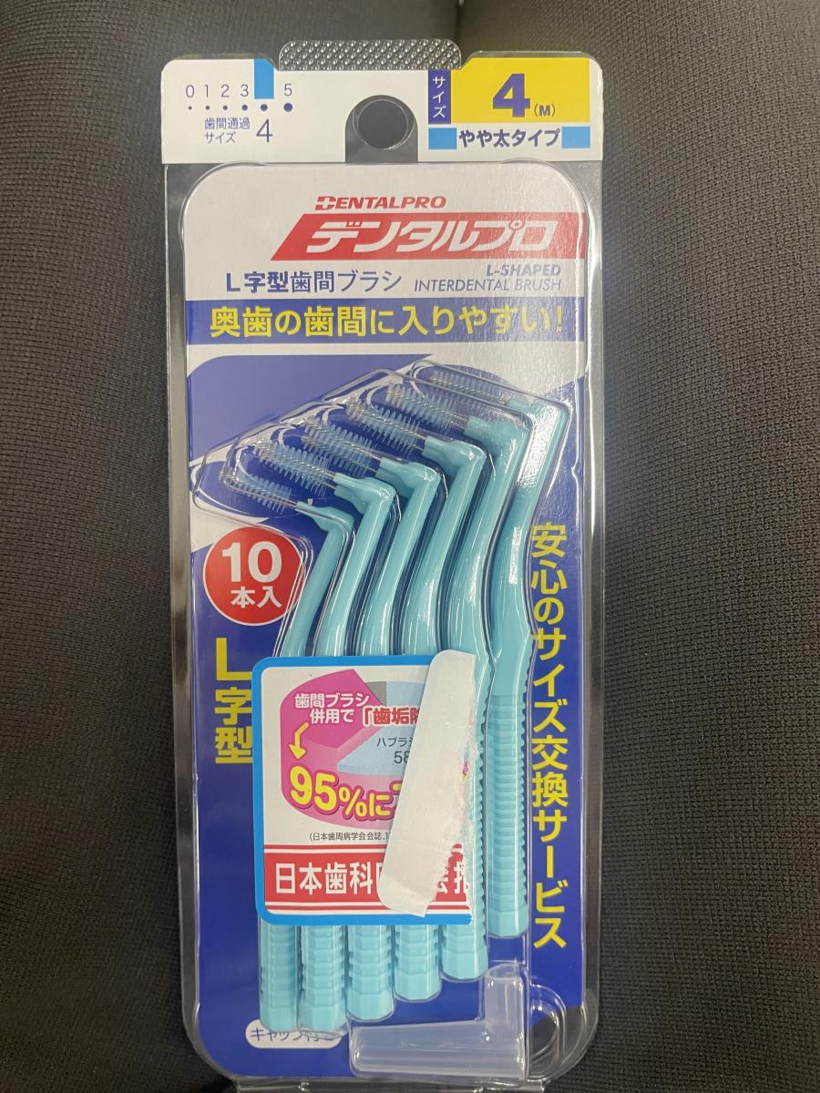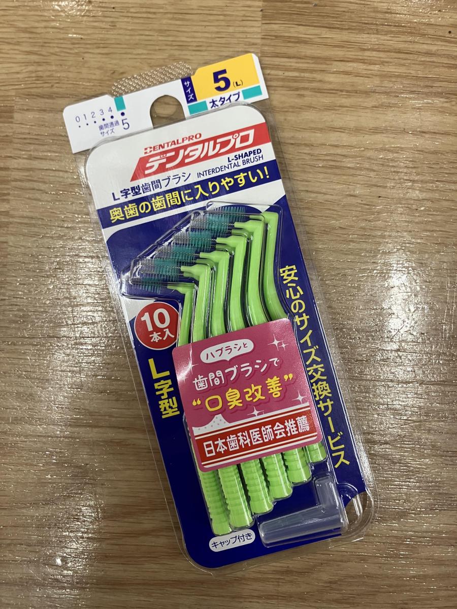 L字型になっていて奥歯のあいだまで、しっかり届く歯間ブラシです。サイズのバリエーションもいくつかあり、自分で使いやすいサイズを選べるのがよいです。