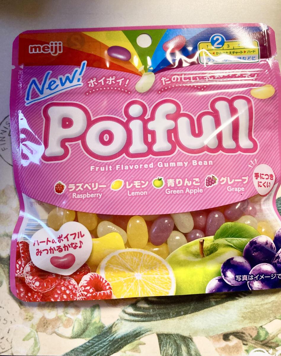 ポイフルが気になり購入してみました。むぎゅっと柔らかいソフト食感が美味しくてやわグミ好きにはぴったりな食感です。ラズベリー、レモン、グレープ、青リンゴと4種類も味が入っており、小さめですが、レモンやラズベリーの甘酸っぱさ、リンゴやグレープの甘みや果汁感が感じられ、一緒に食べても美味しかったです。