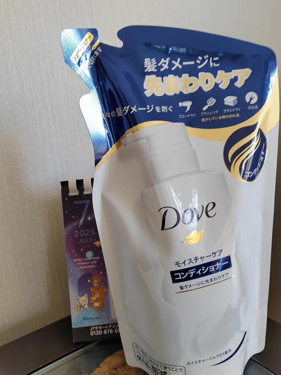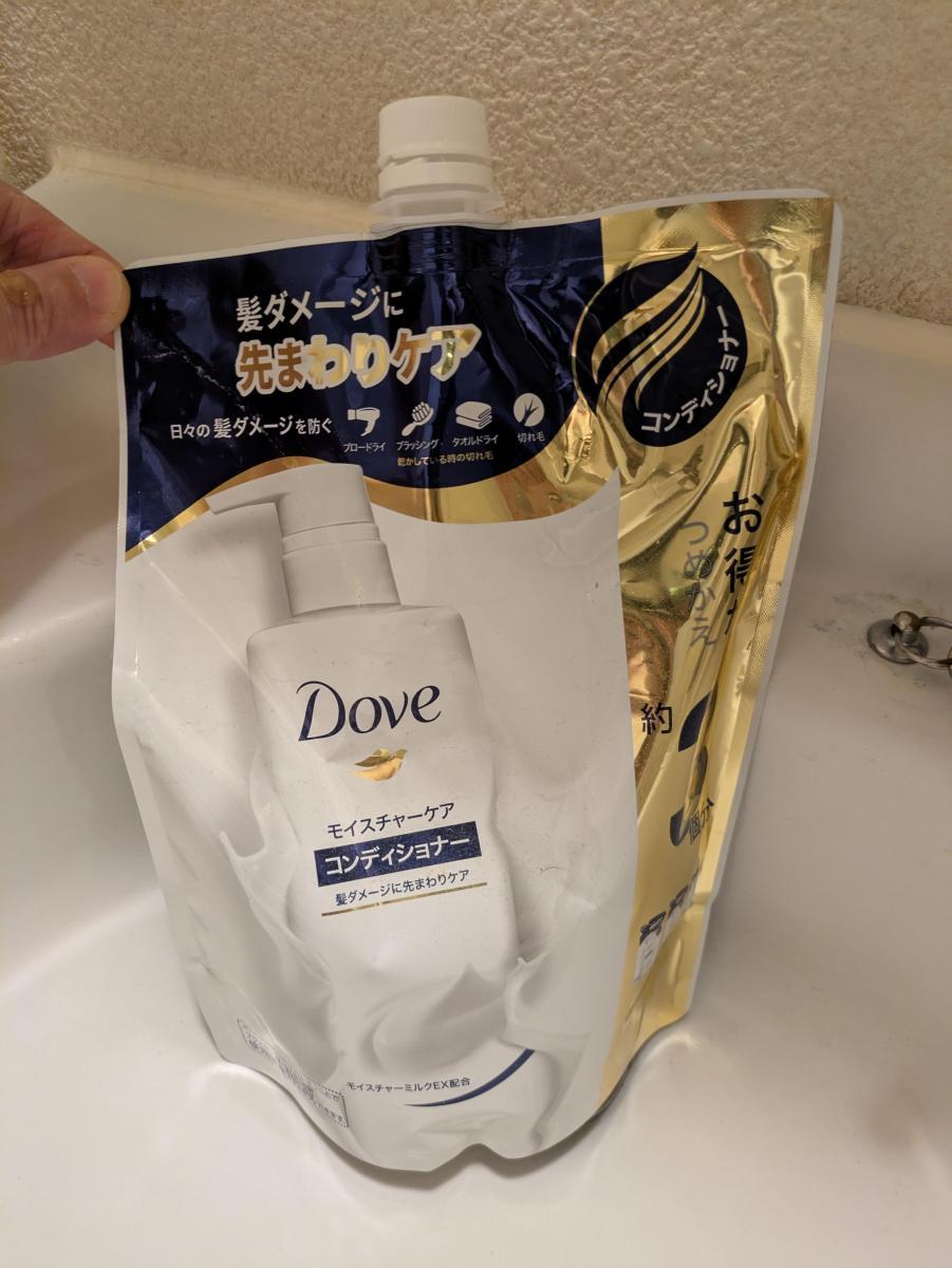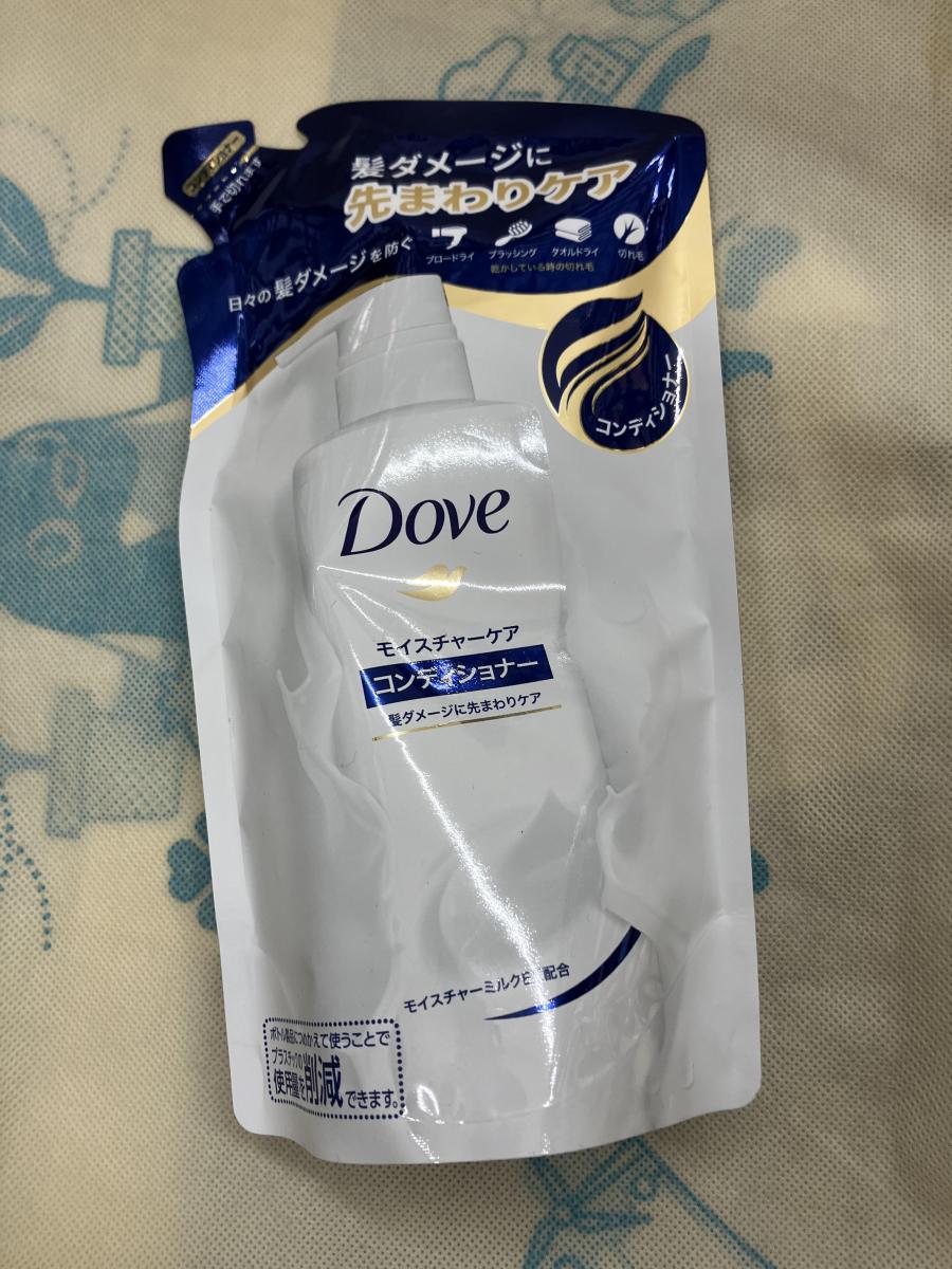 ダブの詰め替え用コンディショナーで容量の割に値段が安くコスパ高いと思います。サラっとしていて使いやすく、使用後は髪の毛がしっとりしてまとまりやすくなります。