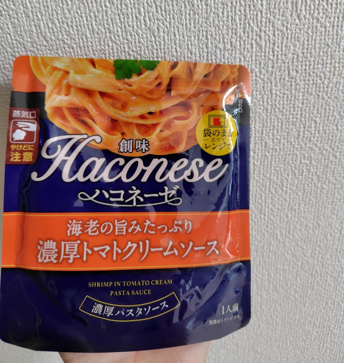 袋のままレンジでチンするだけで使えるハコネーゼのトマトクリームバージョンです。ほどよくトマトの酸味が加わっていますが、海老の旨みがクリームに活きていて美味しいです。