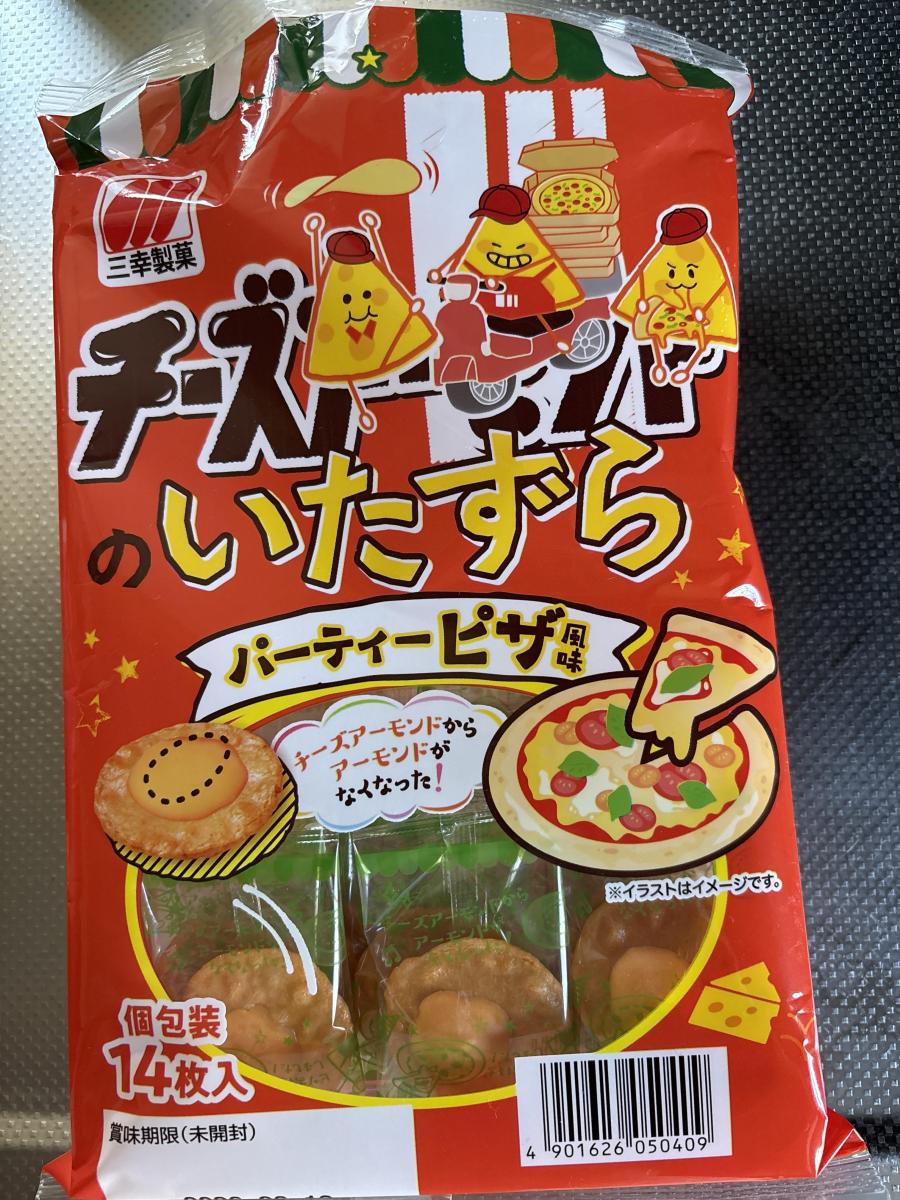 アーモンドが載っていないことをいたずらと表現するセンスが好きです。うす焼きのお醤油味おせんべいにピザソース味のチーズクリームが載っていて、アーモンドがない物足りなさは感じません。その分お値段もお手頃でうれしいです。