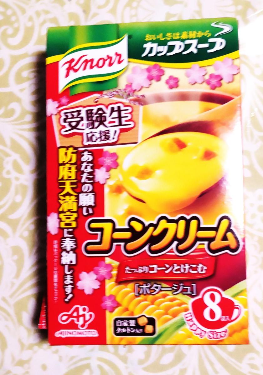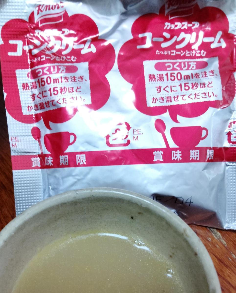 朝夕涼しくなってくると飲みたくなるコーンクリームスープ。忙しい朝は紙コップ、夕食時はちゃんとしたカップに入れていただいてます。お湯を注ぐだけで、ダマにもならず美味しいスープの出来上がり〜。コクもあり、小さなクルトンもよい食感です。