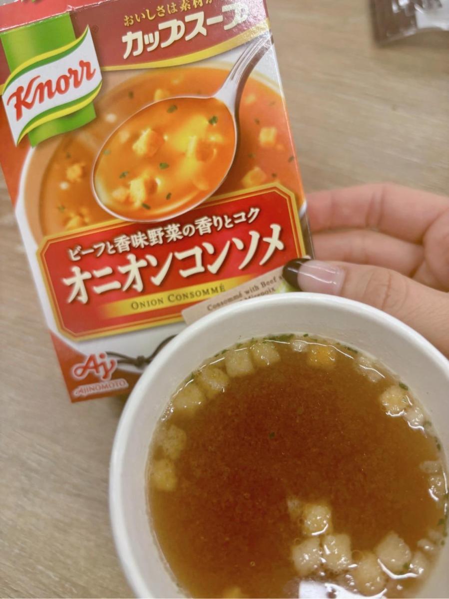 お湯を注ぐだけで美味しいスープが飲める。手軽なので常備しています。小腹が空いた時や、しょっぱいものがほしい時にあると嬉しい。コンソメの濃い感じが好きで、オニオンの風味もあって美味しいです。