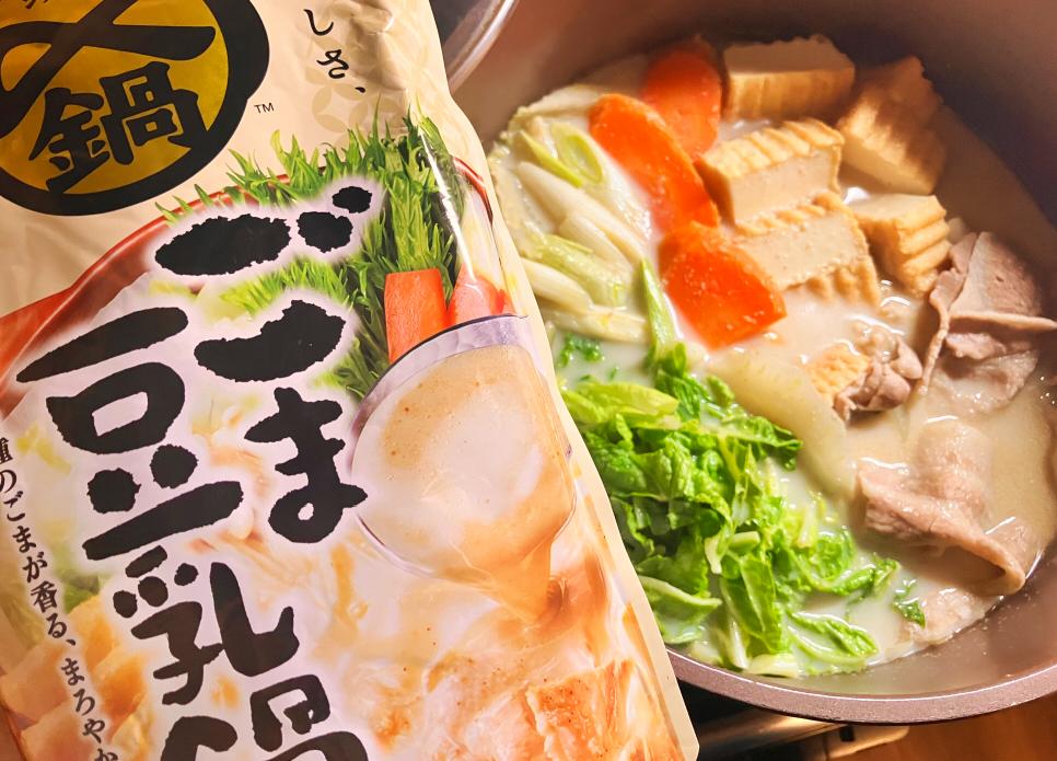 スーパーでも1番目立つところに陳列されていたり特価になっていたりでこの冬よく食べています。これまでは豆乳味ってあっさりしすぎていて物足りないかな、などと思い敬遠気味でしたがそのまろやかさとコクにすっかりハマってしまいました!今では夫も子どもたちもこの豆乳鍋のファンです。