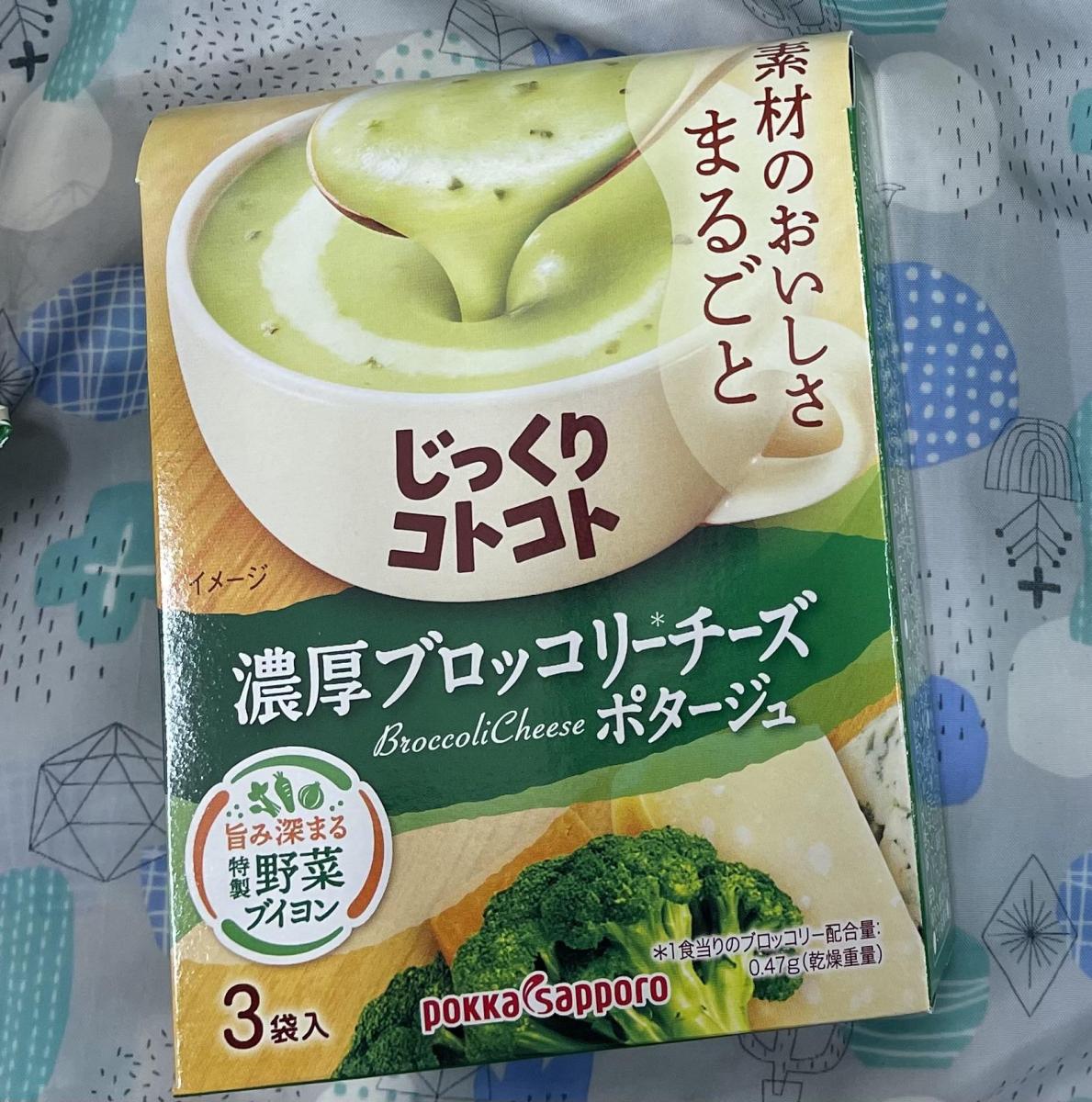 まずスープの色が新鮮なブロッコリーを思わせる緑色をしていて驚きました。パッケージの写真の色味よりももっときれいです。食べてみてまた驚きました。ブロッコリーの味そのまんまだったから。攻めてる!と思いました。ブロッコリーのつぶつぶ感はほとんどなくて、ブロッコリーの味と成分をポタージュしてブイヨンでのばしているのでしょうね。チーズはほんのり感じて、食べやすくしている感じです。ここまでブロッコリー味とは…好ききらいに分かれる気もしますが、個人的にはおいしいと思いました。