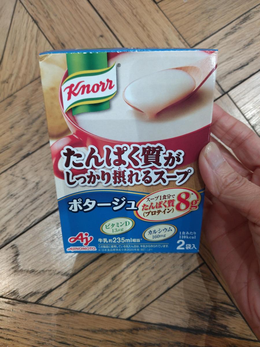 ちょっとタンパク質が足りないかな、という時にタンパク質8グラムの底上げになる、頼もしいスープです。スープのクノールなので美味しい!