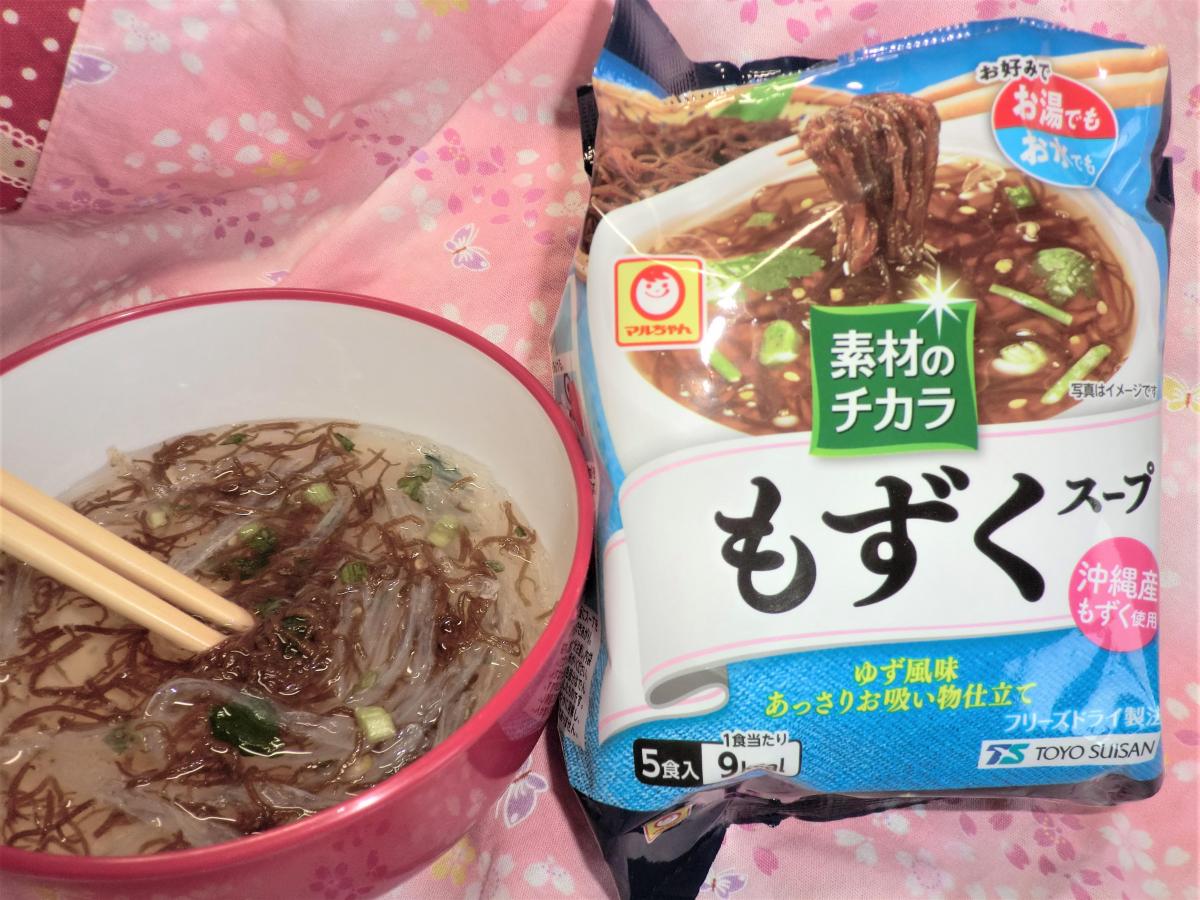 お湯を注ぐと柚子の香りがふわっと広がります。たっぷりのもずくと、爽やかな柚子風味があっさりしていてヘルシーで美味しいです。食物繊維がとれるのも良いですね。