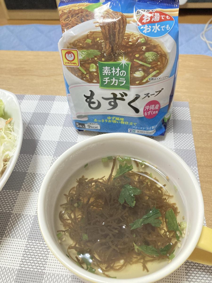 お湯を注ぐだけで簡単にもずくスープの出来上がり。