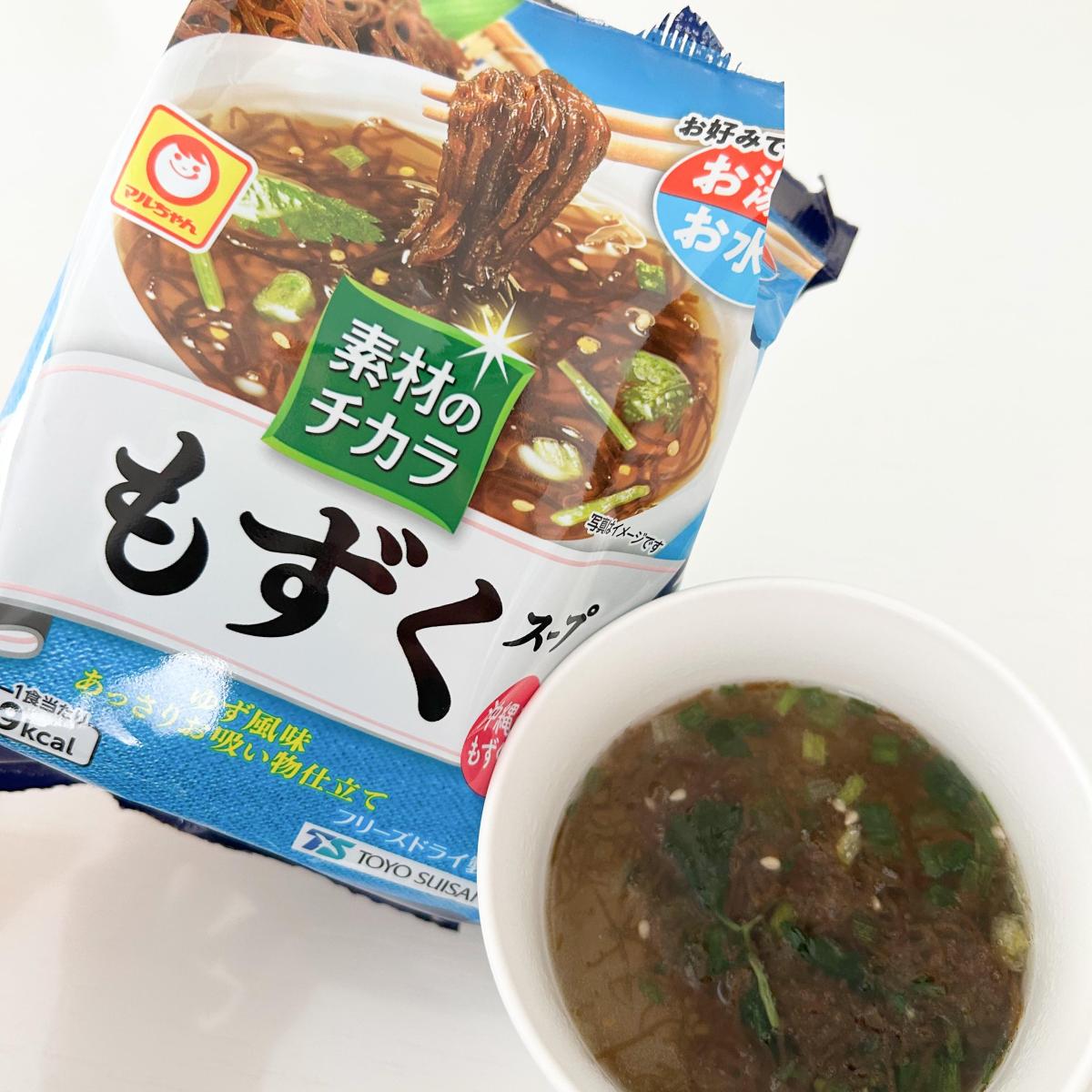 低カロリーで、不足しがちな食物繊維も摂取できるのが嬉しいです。お吸い物仕立てのスープはゆずの風味が程よく、さっぱりと飲めます。もずくは少なめですが、少しとろみのあるスープが美味しくてとても満足できます。