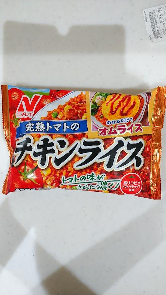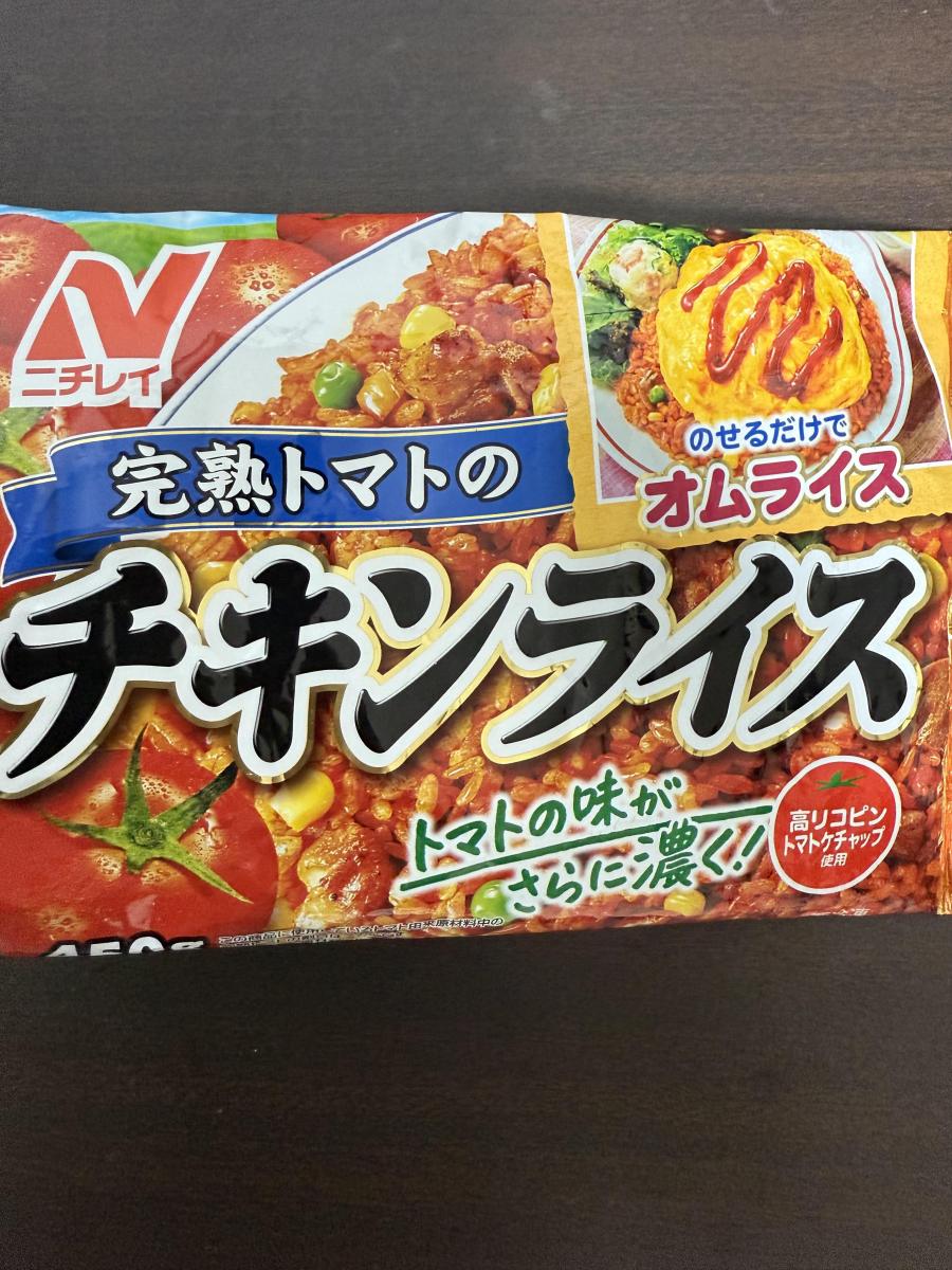 完熟トマトの美味しいチキンライス。トマトの味が濃くて美味しいです。コーン、グリーンピースも入っていて見た目めも綺麗なのでお弁当にも活用しています。そのままでも美味しいですが、卵を焼いてのせてオムライスにしても美味しいです。
