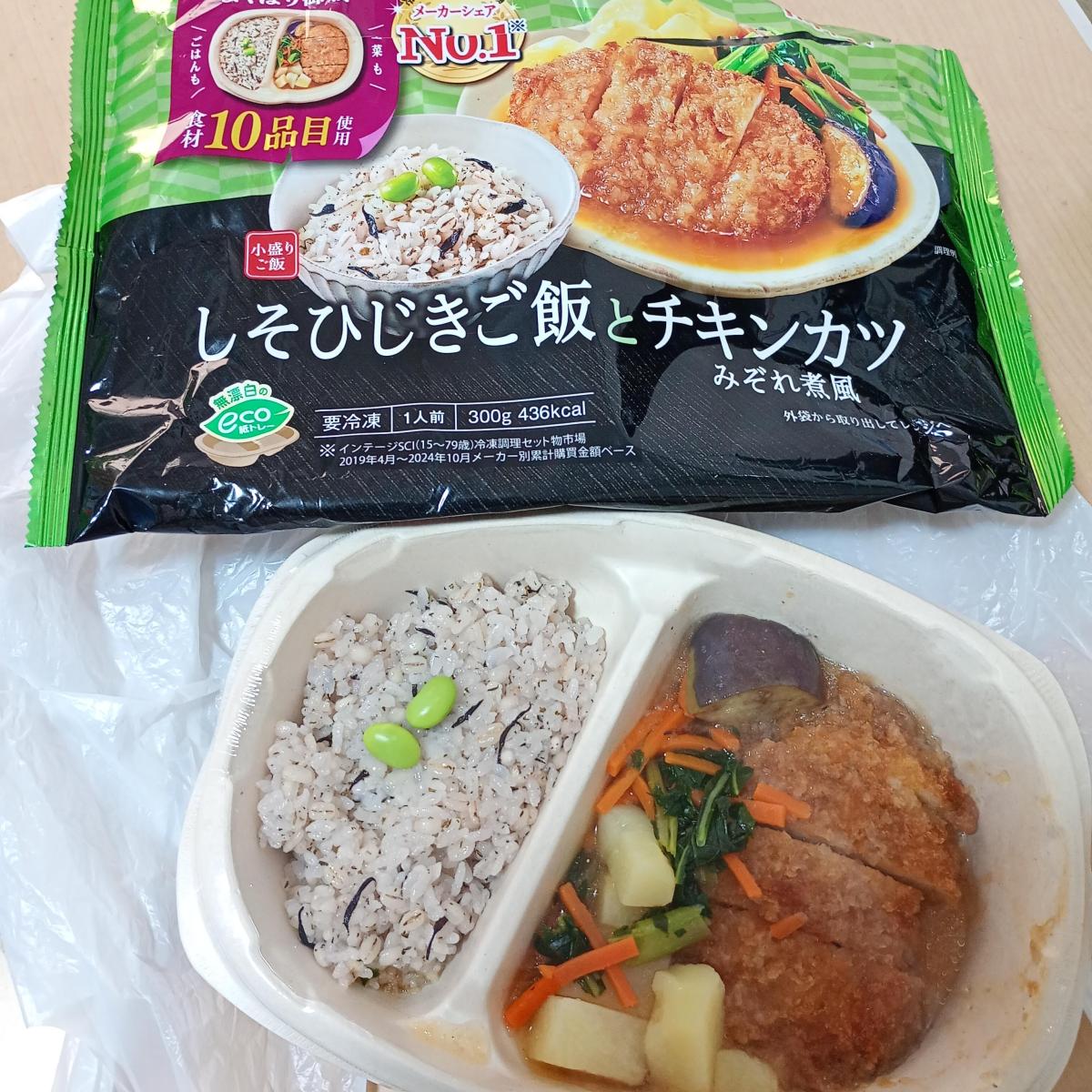 しそひじきご飯の爽やかで優しい味わいが美味しく、チキンカツにみぞれ煮がしみていてチキンは柔らかく食べやすいです。なすなどの野菜も付け合わせであるのが彩りも楽しめて
