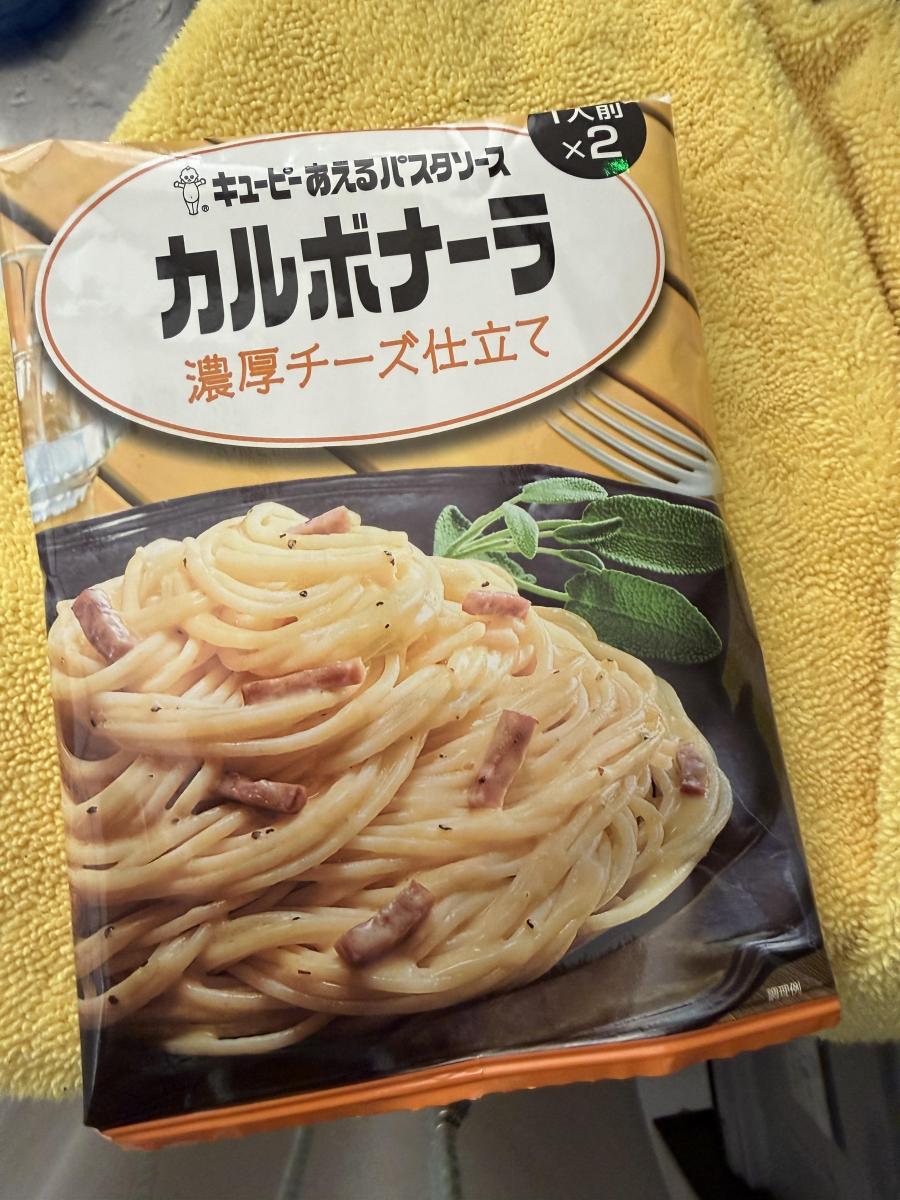 あえるだけのパスタソース。最近はこれが便利でいいですね。シンプルな味で、ソースがすこし卵黄の黄味がかっている感じ。チーズ臭さが少なくて食べやすいです。お子さまも食べられる感じだと思います。