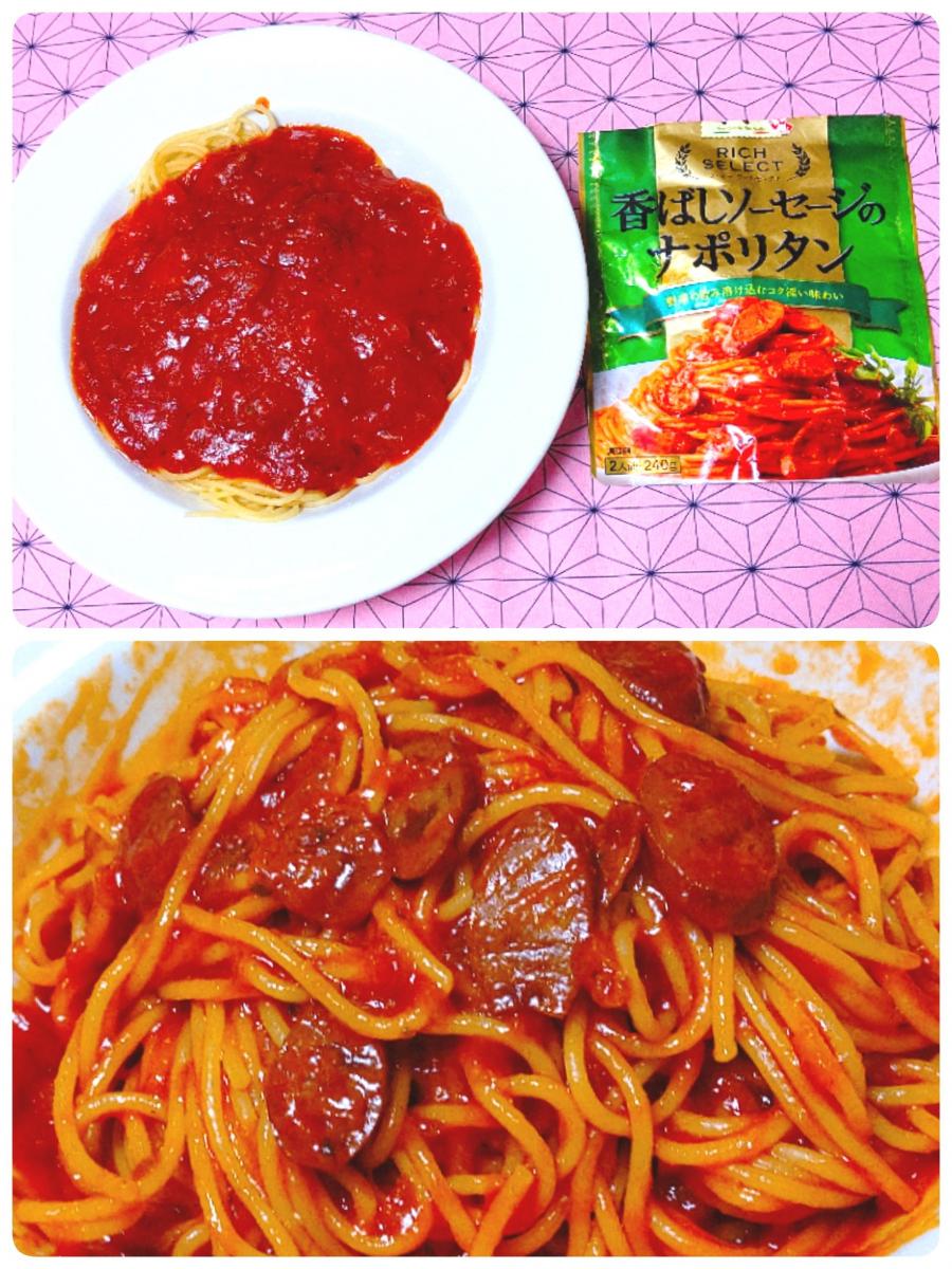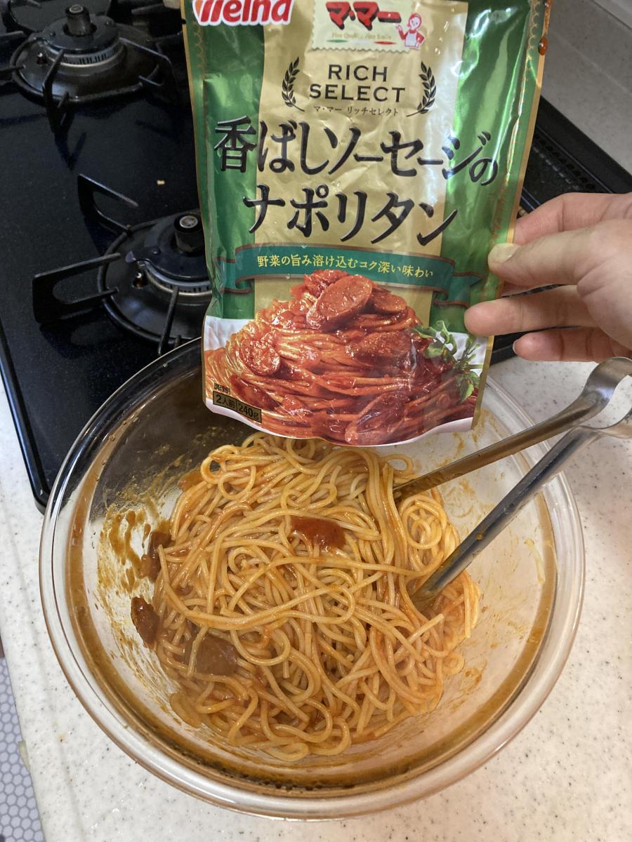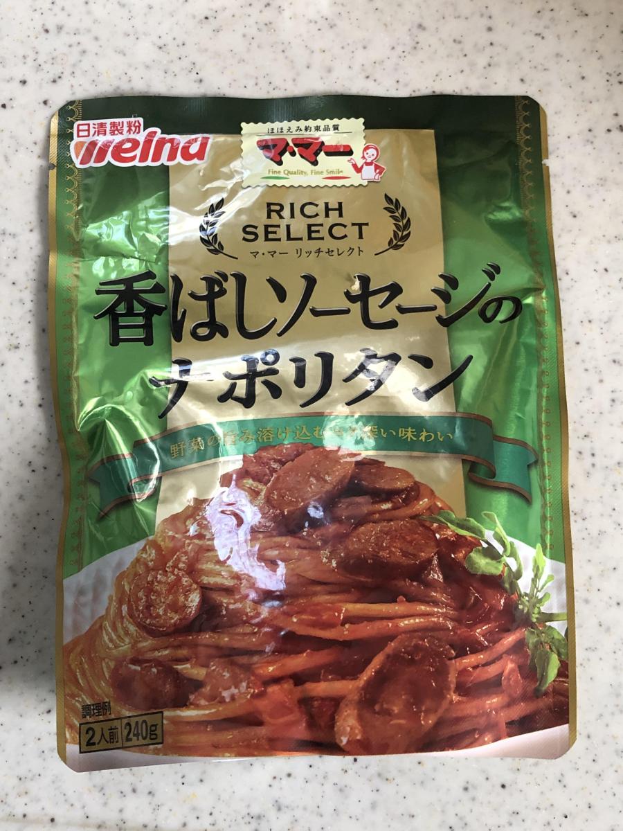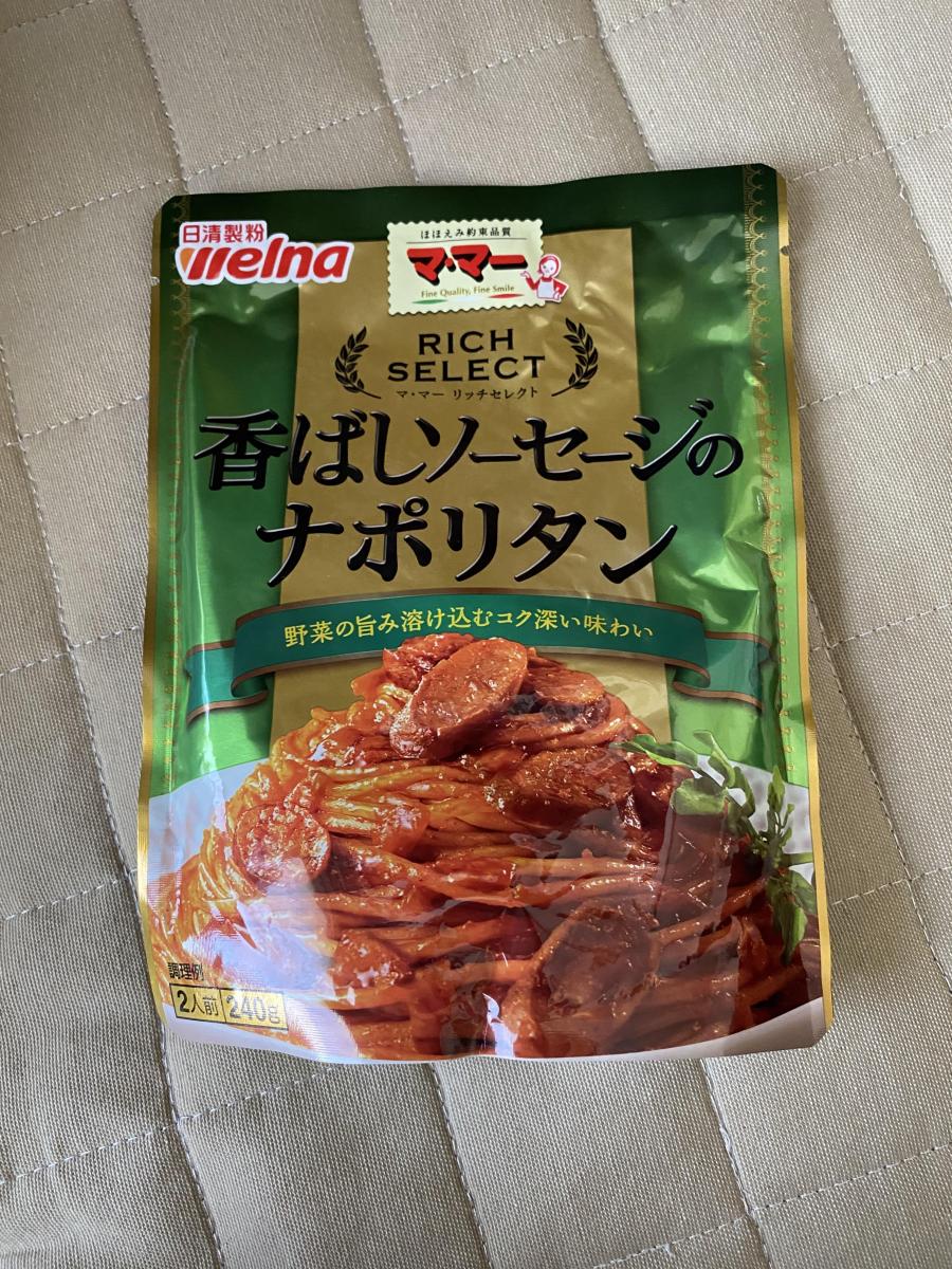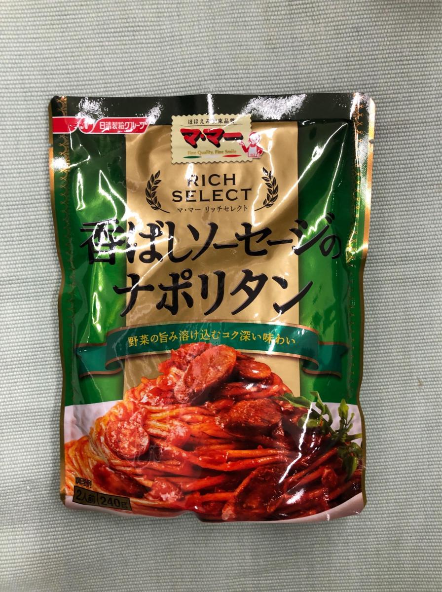 ナポリタンが食べたくなりママーのリッチセレクトの香ばしソーセージのナポリタンを買ってきました。玉ねぎ、ニンジン、トマトの旨味か溶けてこくのあるソースだそうです。作ってみたらパスタに絡みやすくとてもしっかりした味になり美味しいです。
